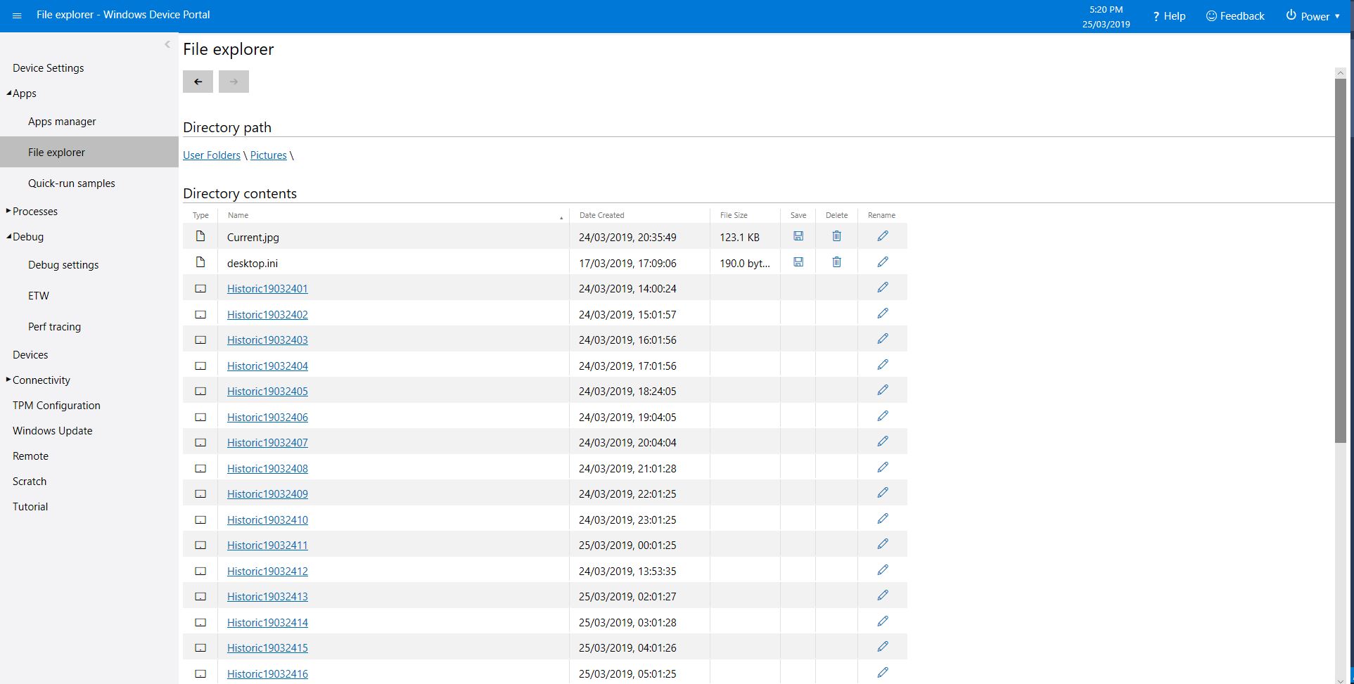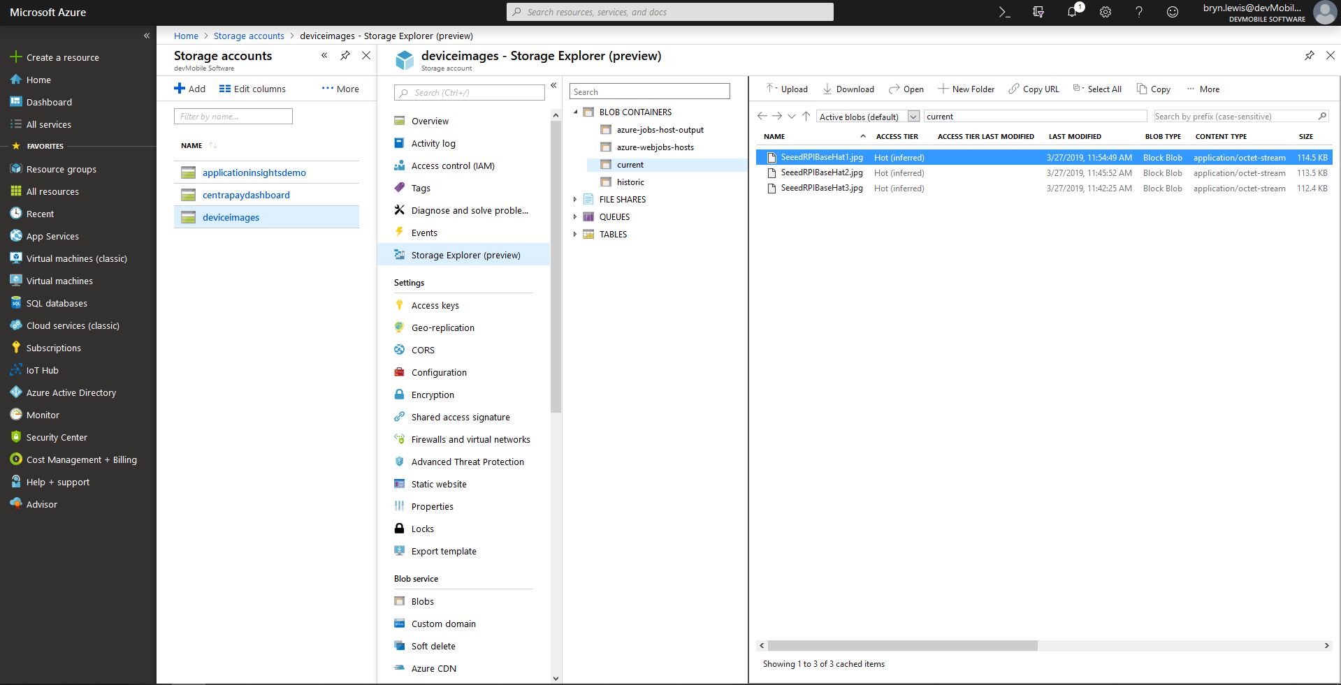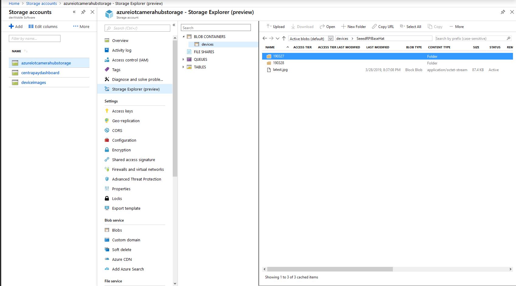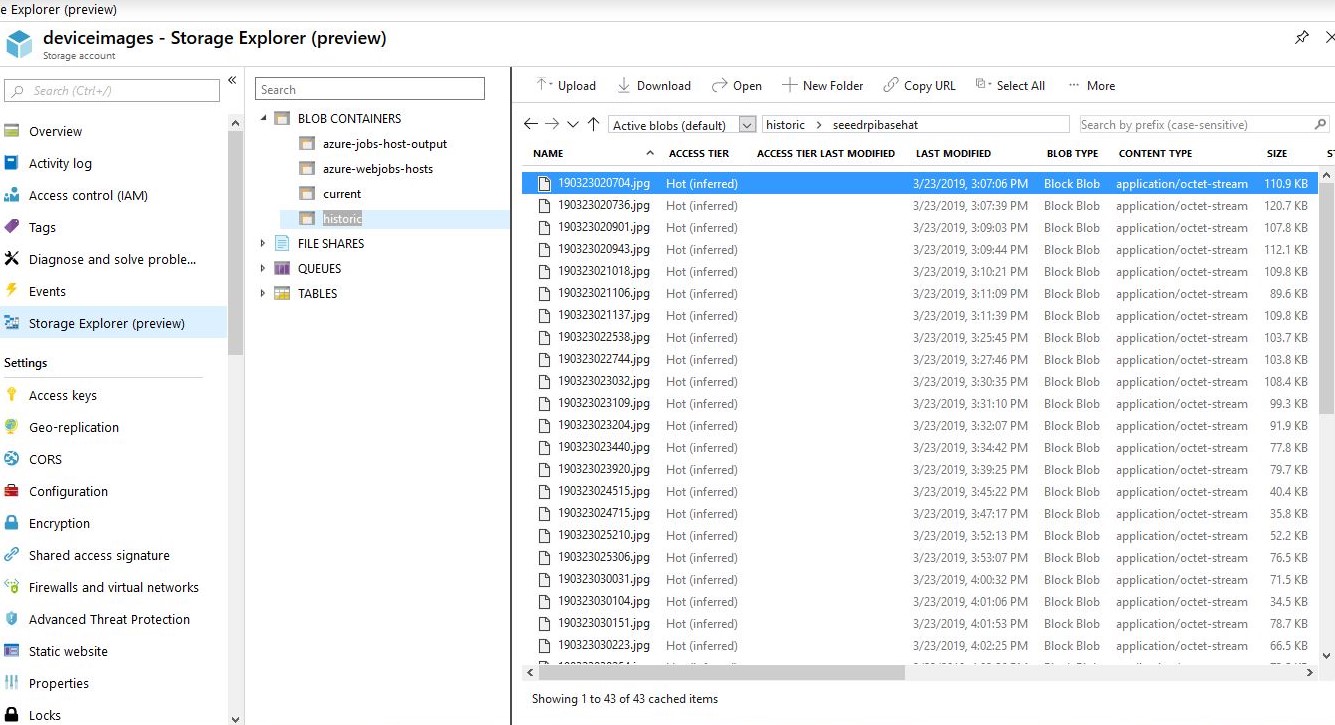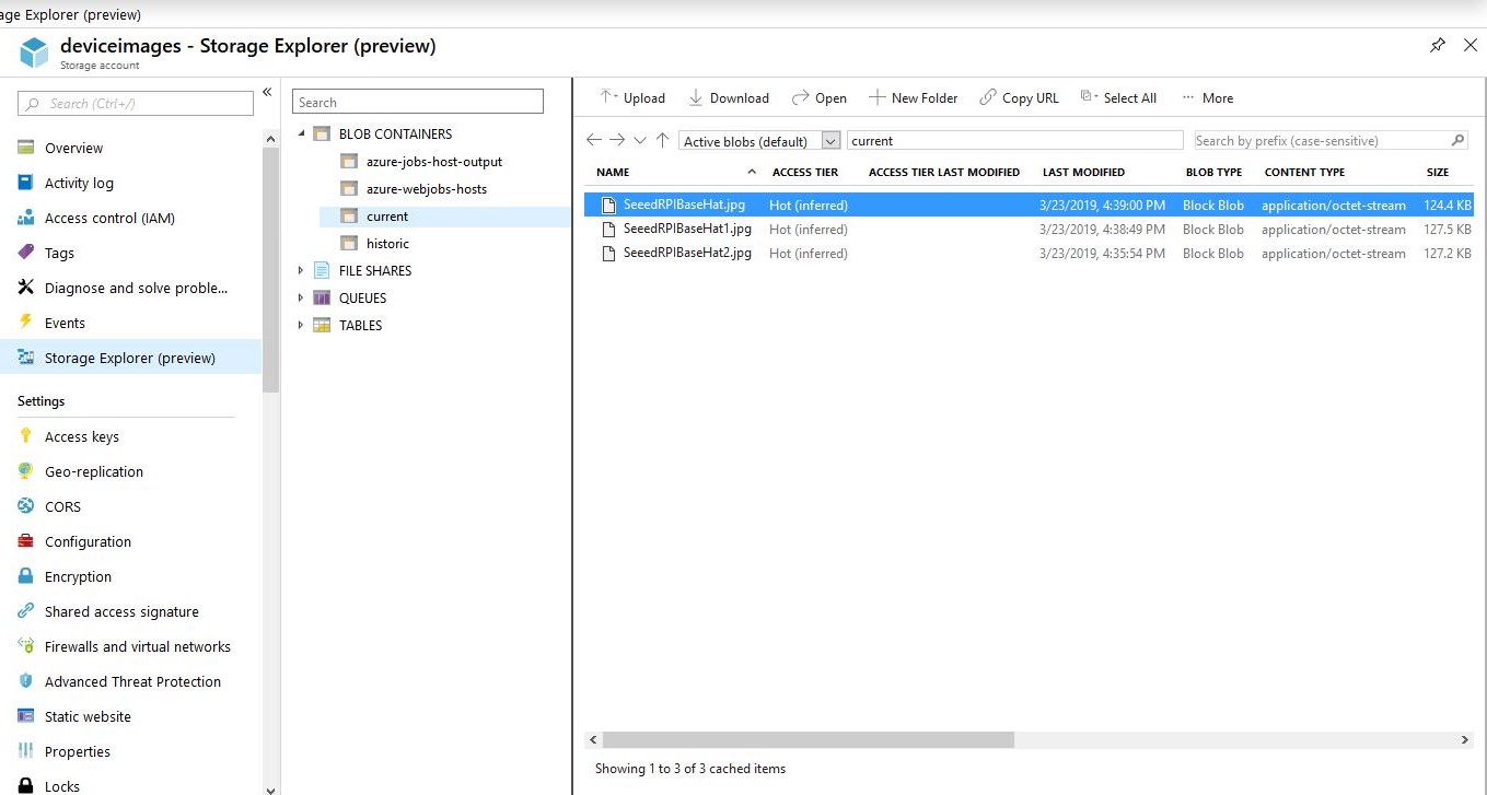 The application captures images with a configurable period after configurable start-up delay. The Azure storage root folder name is based on the device name in the Azure IoT Hub connection string. The folder(s) where the historic images are stored are configurable and the images can optionally be in monthly, daily, hourly etc. folders. The current image is stored in the root folder for the device and it’s name is configurable.