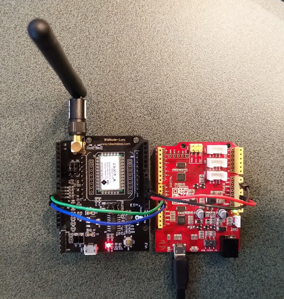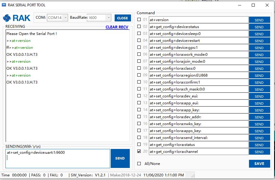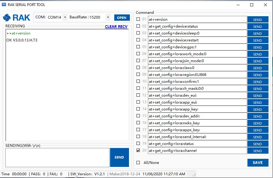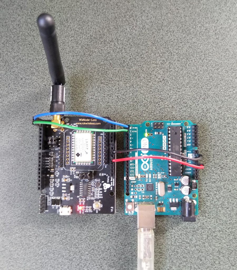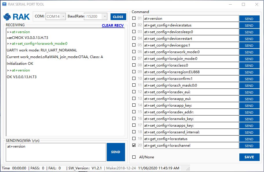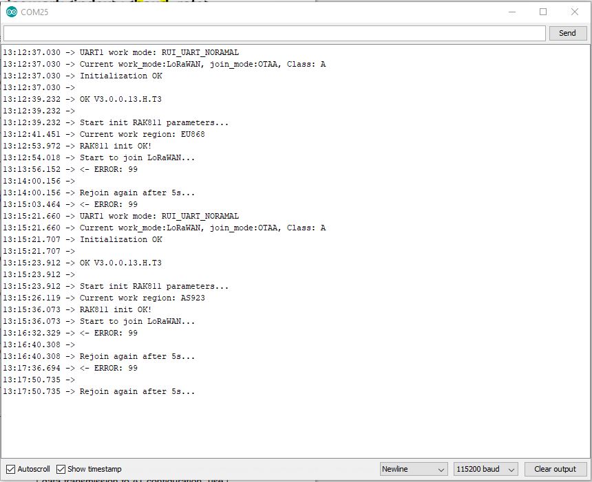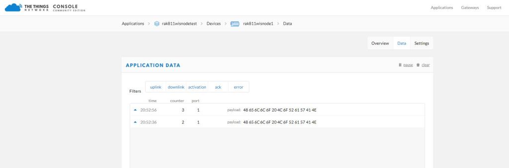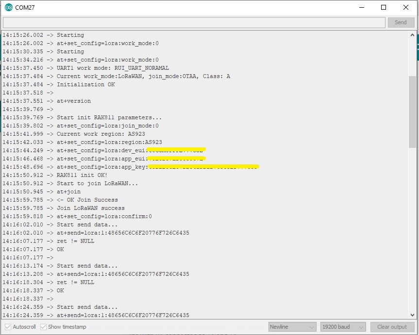 If the RAK811 module is initialised, then connects to the network successfully, the application sends “48656c6c6f204c6f526157414e” (“hello LoRaWAN”) every 20 seconds.