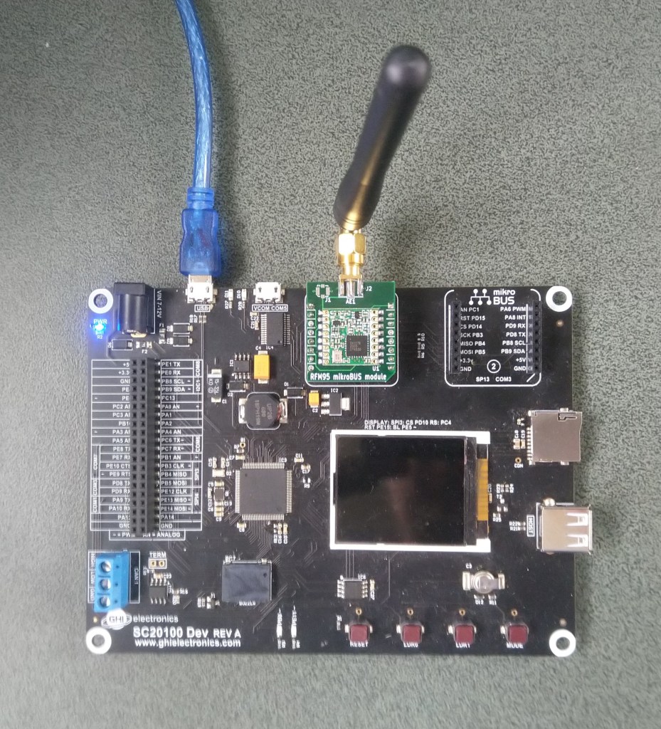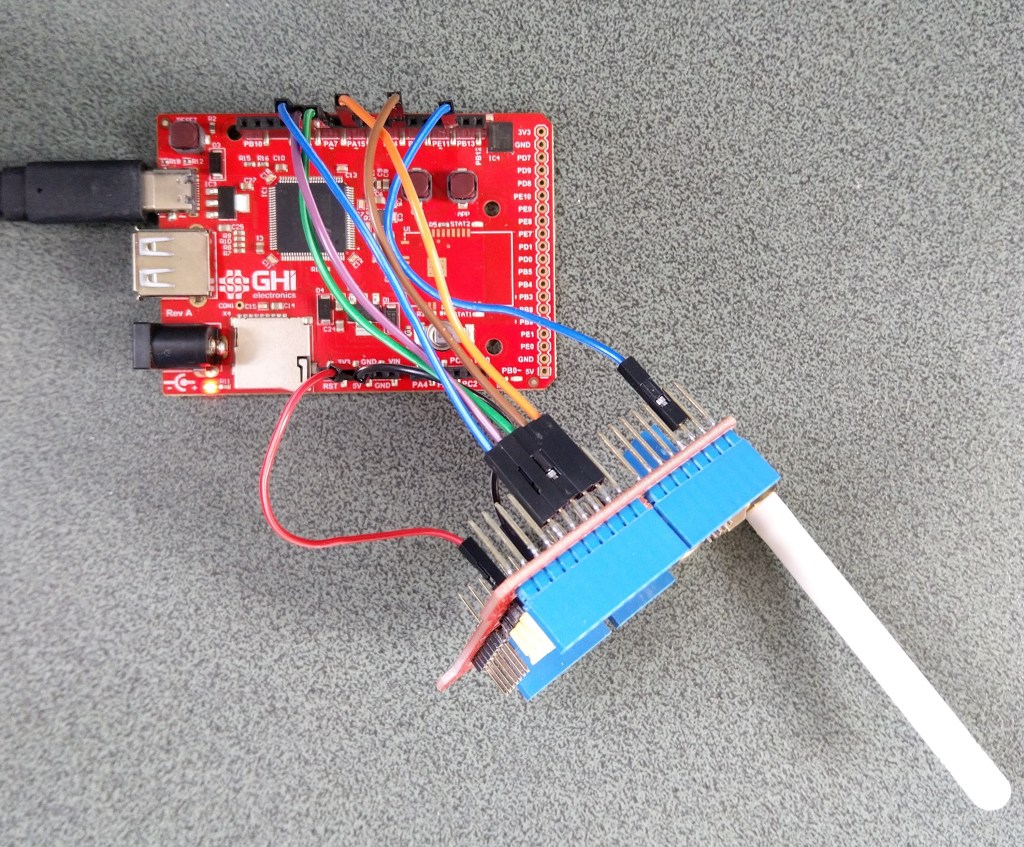 My initial test rig uses a Netduino 3 Wifi and an Embedded Coolness nRF24 shield as I didn’t need to use jumper wires.