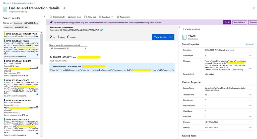 My controller logged events to Azure application Insights so I could see if there were any errors and inspect message payloads. The TTN developers provide sample payloads to illustrate the message format but they were a bit chunky for my initial testing.