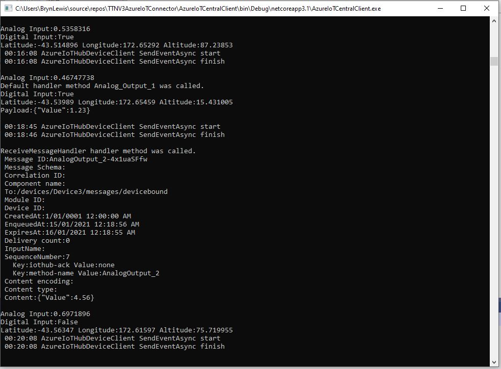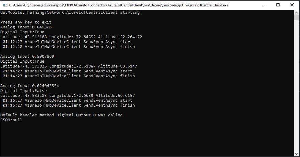 My Azure IoT Central client application displays the generated message including the decoded payload field which is used by the built in Low Power Protocol(LPP) decoder/encoder and other custom encoders/decoders.