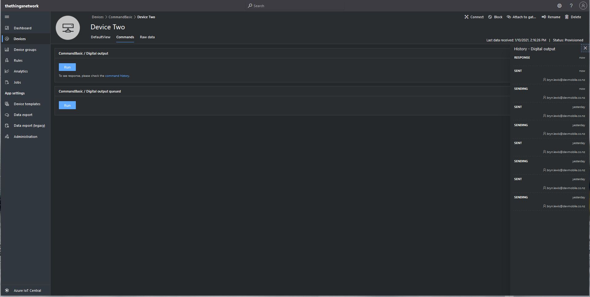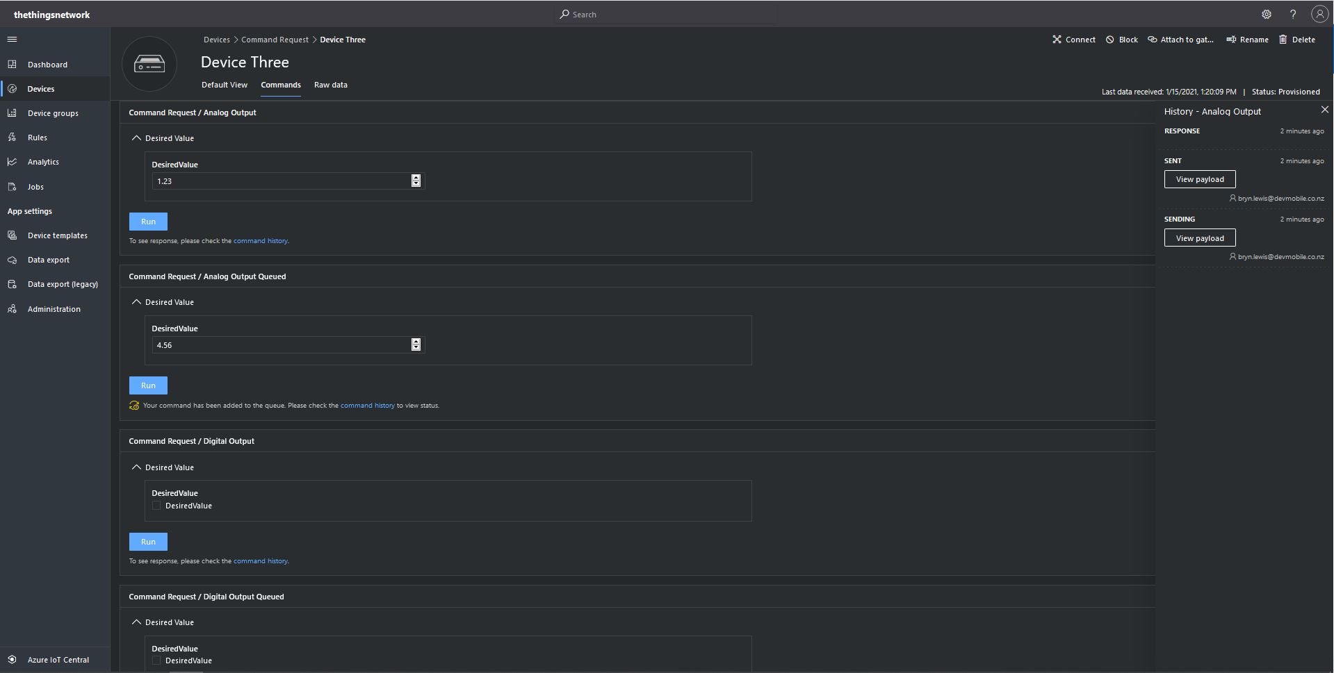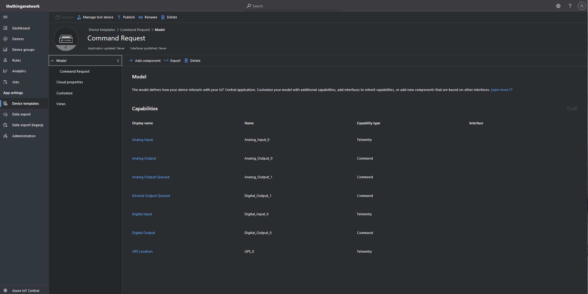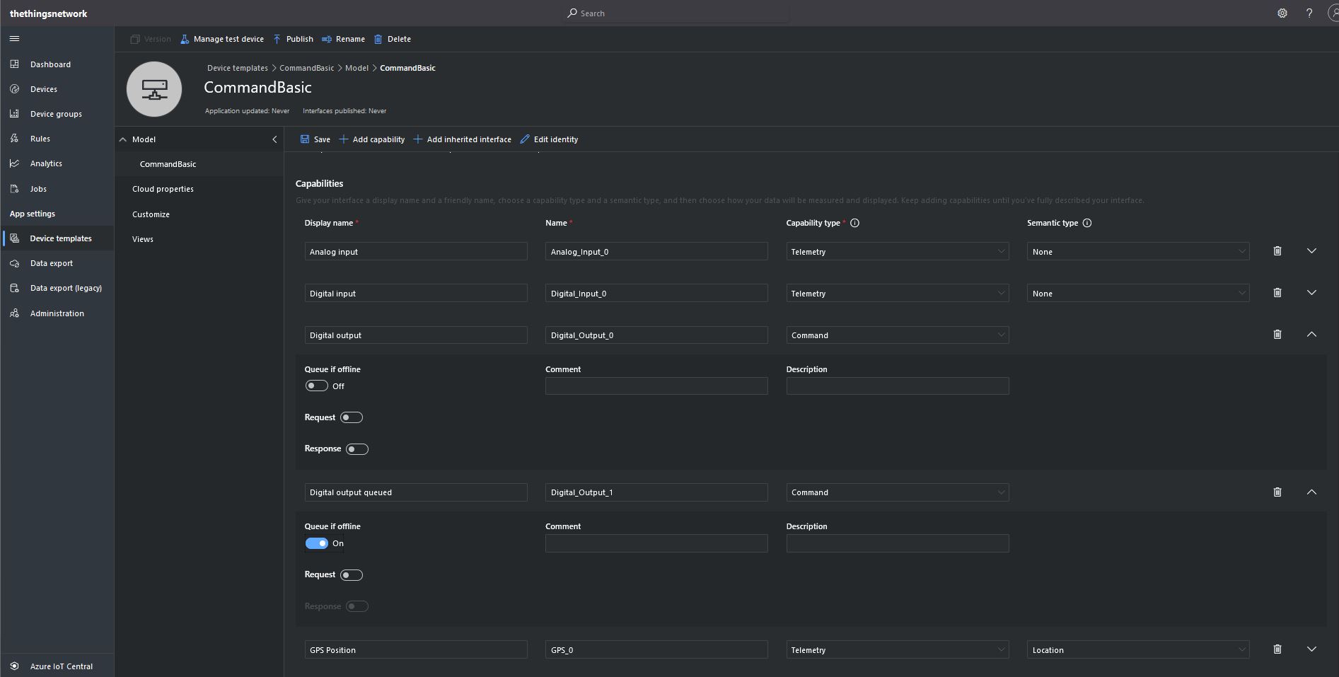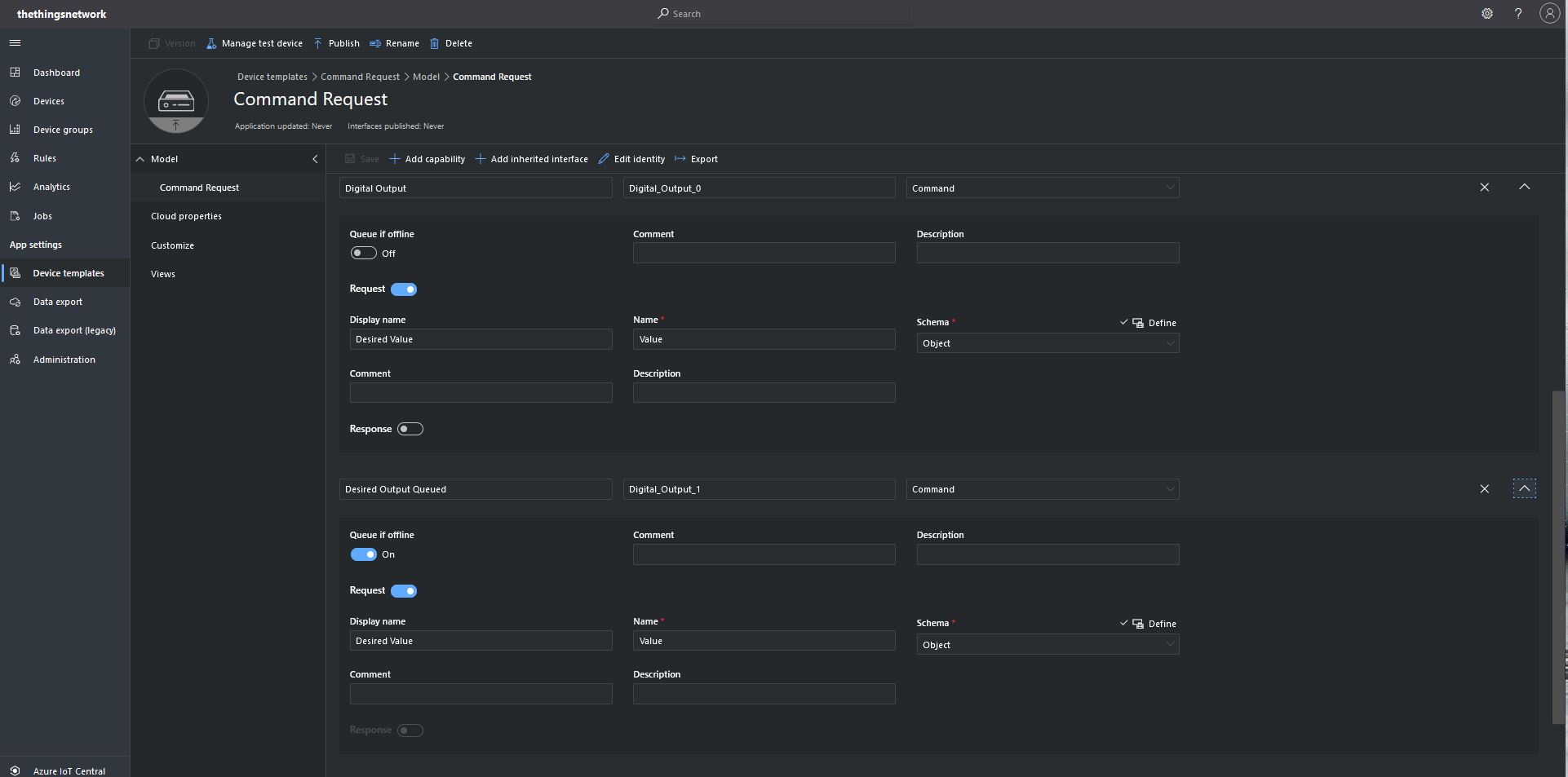 I have built a several Proof of Concept(PoC) applications (Azure IoT Central Basic Telemetry, Basic Commands, and Request Commands) to explore to how an Azure IoT Central integration with TTN could work. This blog post is about how to configure queued and non queued Cloud to Device(C2D) Commands with request parameters so they should work with my TTN Message Queue Telemetry Transport(MQTT) Data API connector.