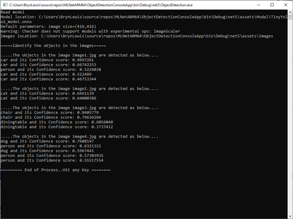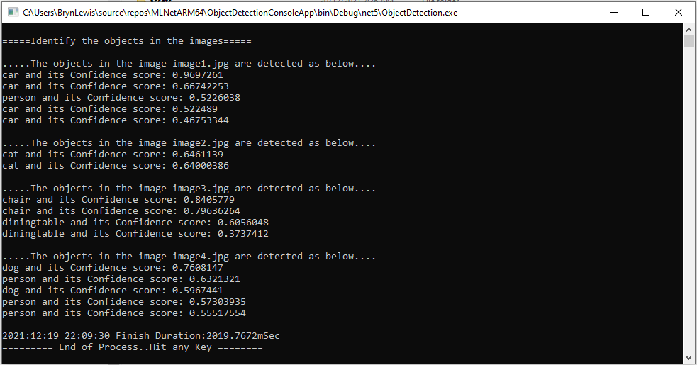 The next step of my Proof of Concept(PoC) was to get the YoloV5 Object Detection sample application working on my Intel(R) Core(TM) i7-8700T CPU @ 2.40GHz 2.40 GHz desktop development system. After debugging the software with Visual Studio I “published” the application to a folder.