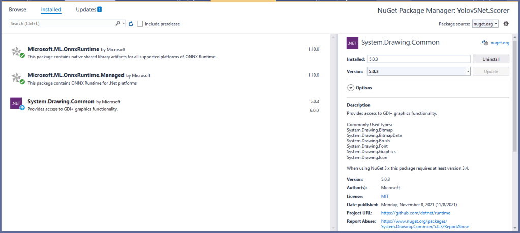 The sample application only had one dependency Microsoft.ML.OnnxRuntime which I was able to drop as it was referenced by the YoloV5Net.Scorer.
