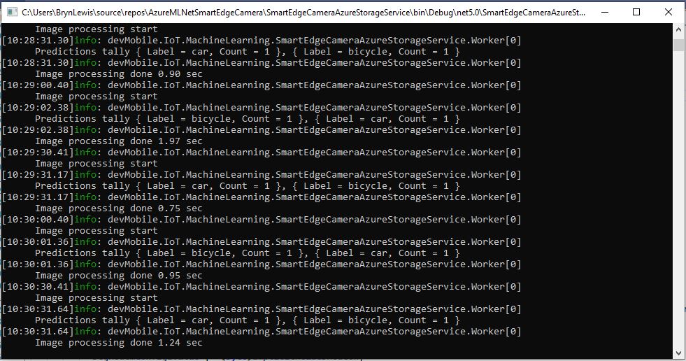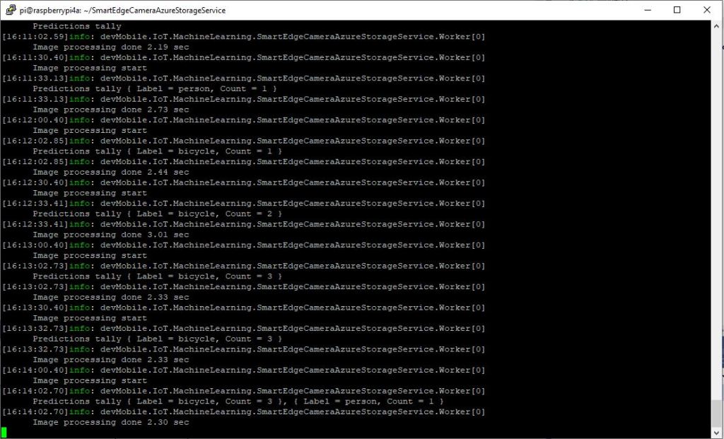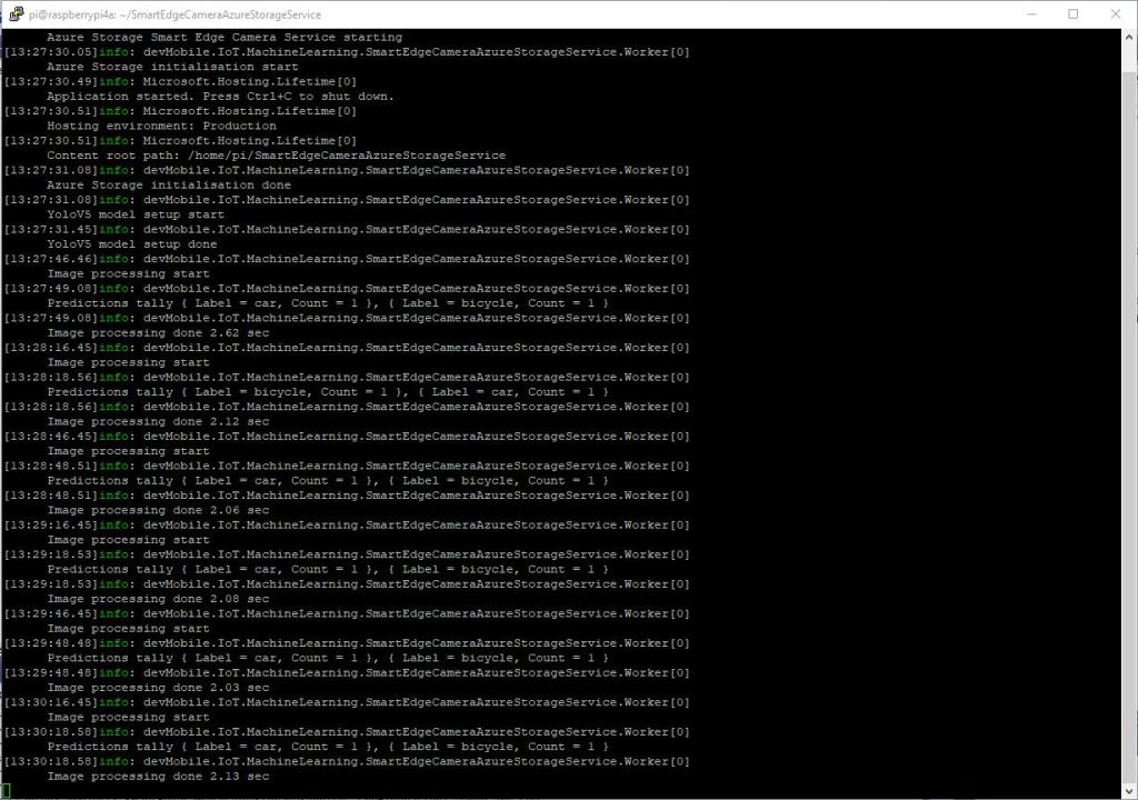 The Raspberry Pi 4B 8G took on average 2.18 seconds to download an image from the camera, run the model, then upload the two images to Azure Storage
