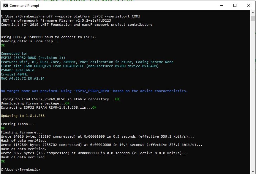 The .NET nanoFramework nanoff utility identified the device, downloaded the runtime package, and updated the device.