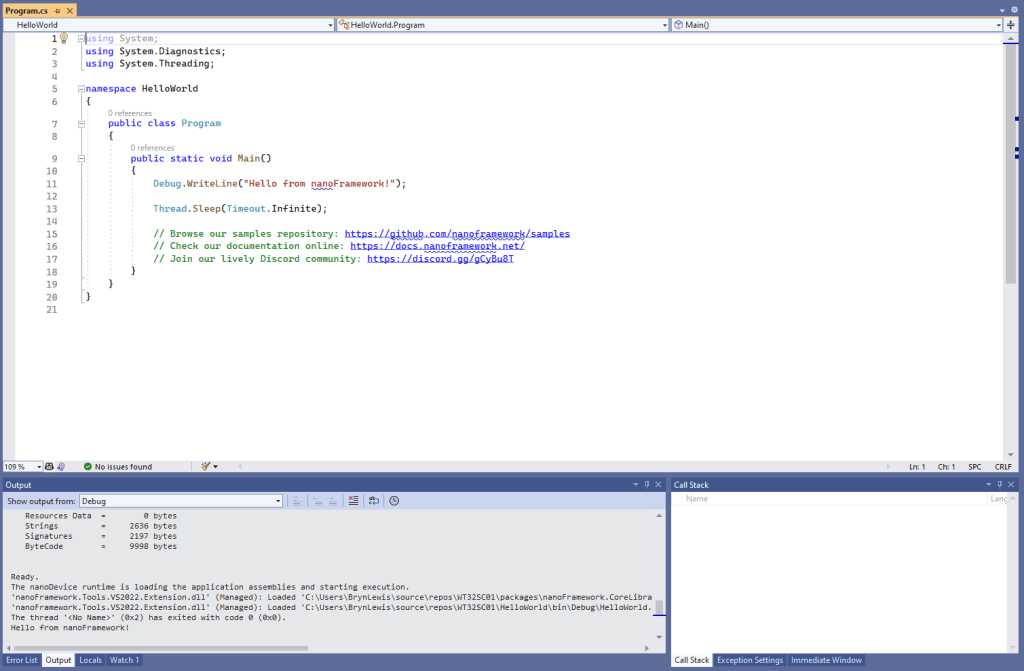 The next step was to run the blank NET nanoFramework sample application.