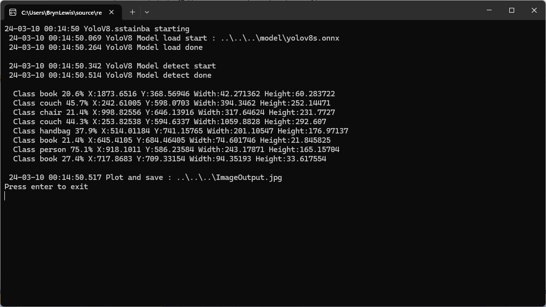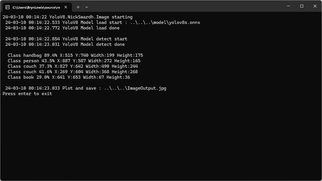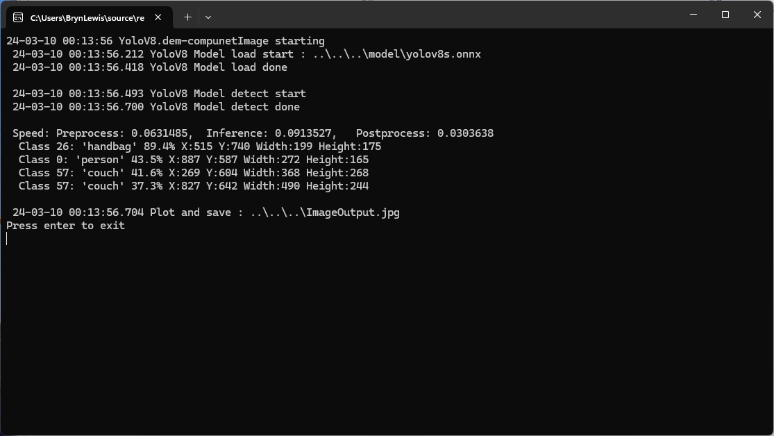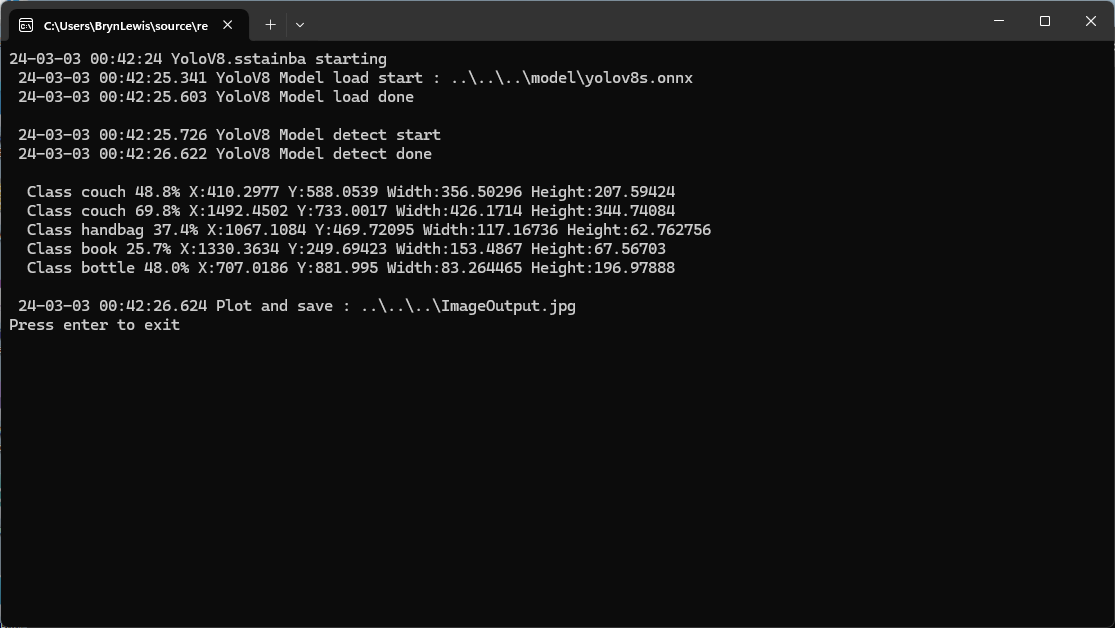 Console.WriteLine($"{DateTime.UtcNow:yy-MM-dd HH:mm:ss:fff} YoloV8 Security Camera Image processing done");