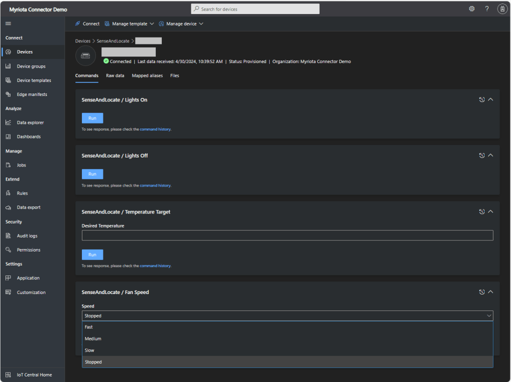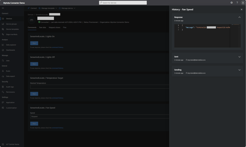 This post is about Azure IoT Central downlink methods and should be read in conjunction with the Myriota Connector – Azure IoT Central Downlink Methods post. My Myriota Sense and Locate template has 4 commands and in this post, I have focused on the fan speed command.