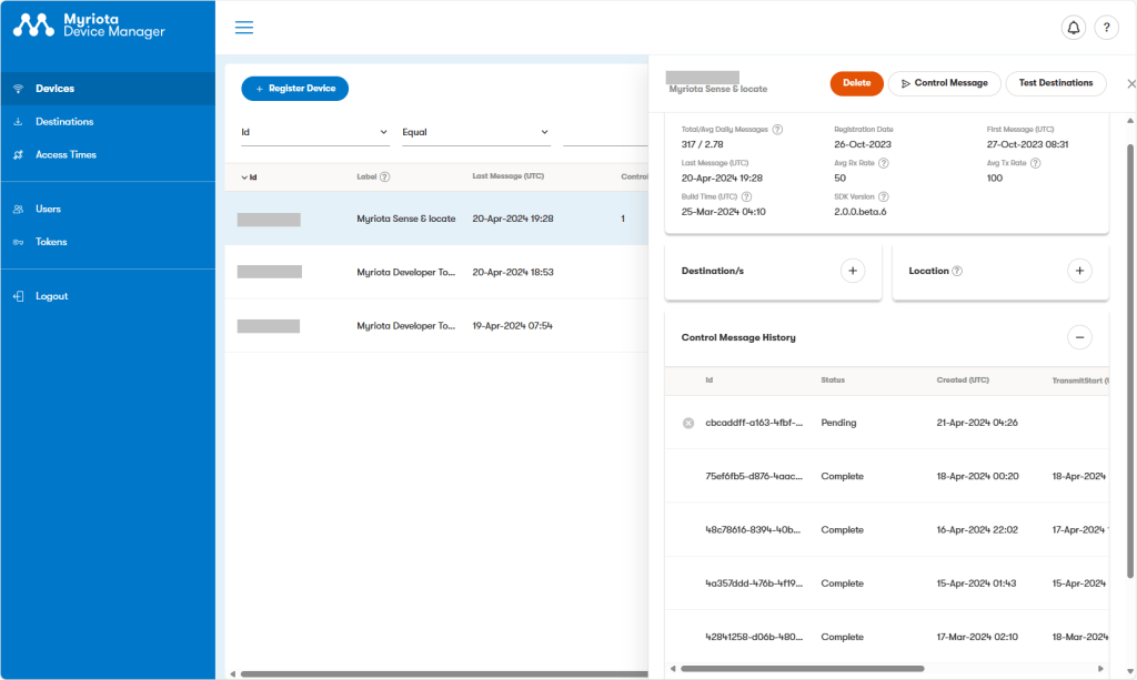 In the Myriota Device Manager the status of Control Messages can be tracked and they can be cancelled if in the “pending” state.
