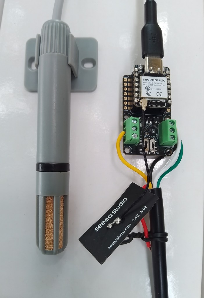 This sensor has an operating voltage of 3.6-30V/DC so it can be powered by the 5V output of a RS485 Breakout Board for Seeed Studio XIAO (SKU 113991354). The red wire is for powering the breakout and device with a 12V power supply so was tied back so it didn’t touch any of the other electronics.