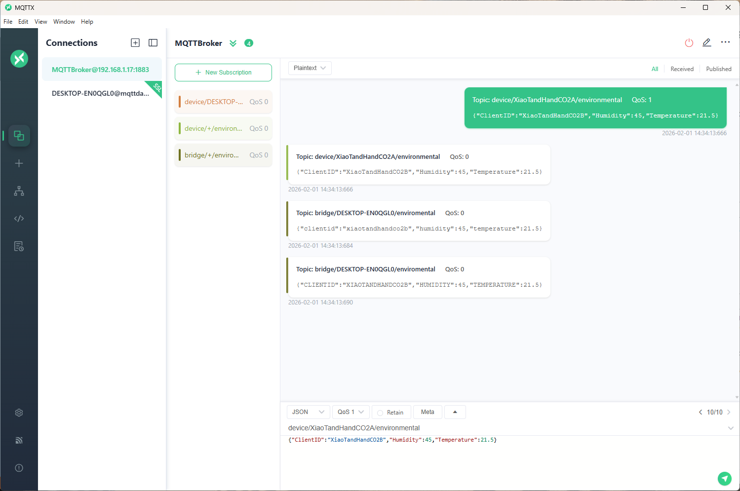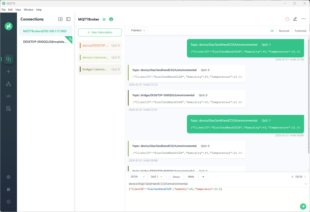 The MQTTX application subscribed to topics that devices (XiaoTandHandCO2A, XiaoTandHandCO2B etc.) and the simulated bridge (DESKTOP-EN0QGL0) published.