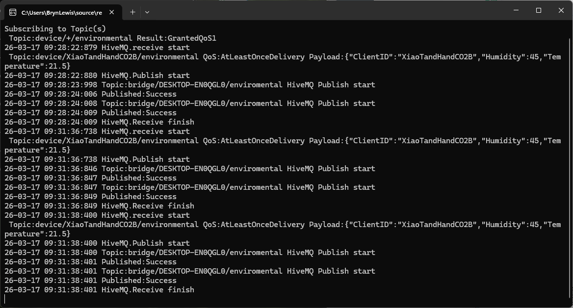 The MQTTX application subscribed to topics that devices (XiaoTandHandCO2A, XiaoTandHandCO2B etc.) and the simulated bridge (in my case DESKTOP-EN0QGL0) published.