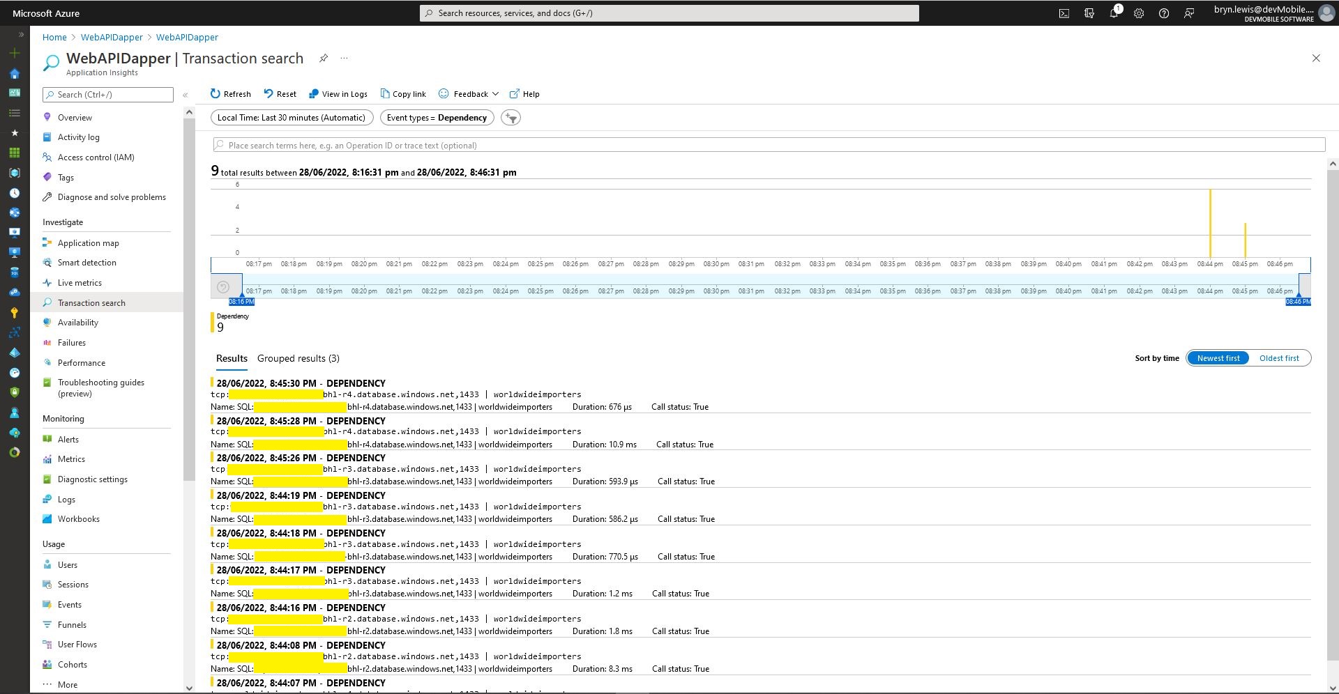 Azure application Insights Dependencies showing usage of different synchronised databases