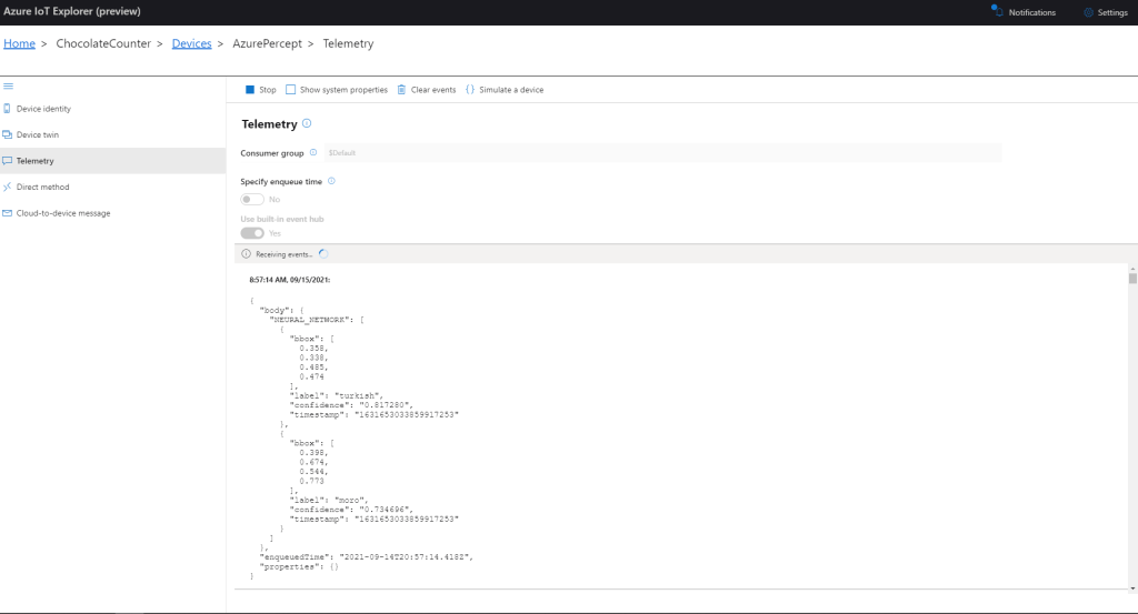 After several iterations the accuracy of the chocolate bar object detection model was acceptable I wanted to examine the telemetry that was being streamed to my Azure IoT Hub.