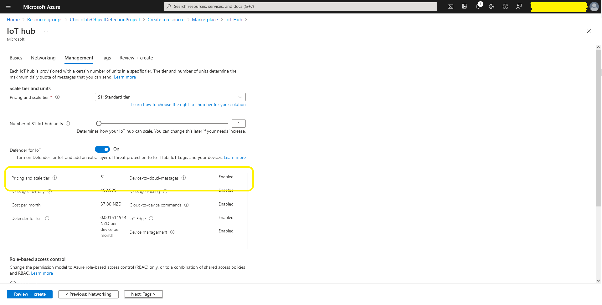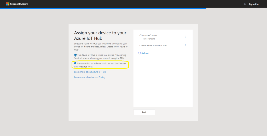 I had manually created the Azure IoT Hub and selected the “Free Tier” (I was trying to keep my monthly billing reasonable) then as I was stepping through the Azure Percept setup wizard I didn’t read the warning message highlighted below.