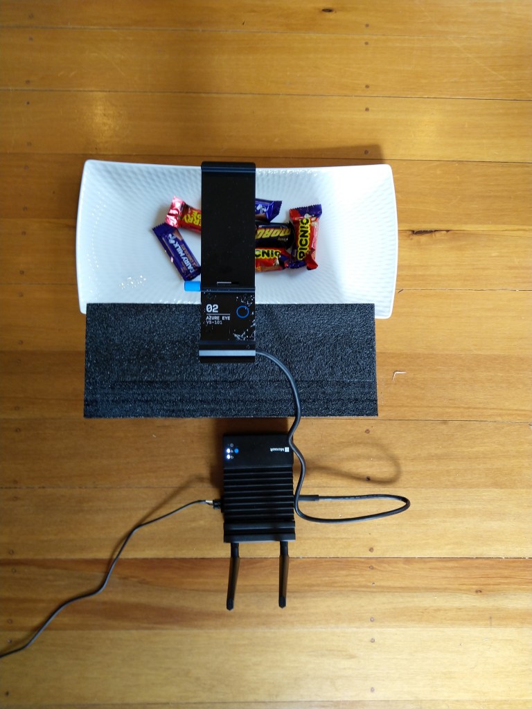 When I had to collect some more images for a blog post, I found the intern had consumed quite a few of the “props” and left the wrappers in the bottom of the Azure Percept packaging.