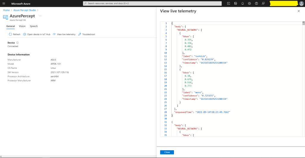 In Azure Percept Studio I could view (in a limited way) inferencing telemetry and check the quality and format of the results.