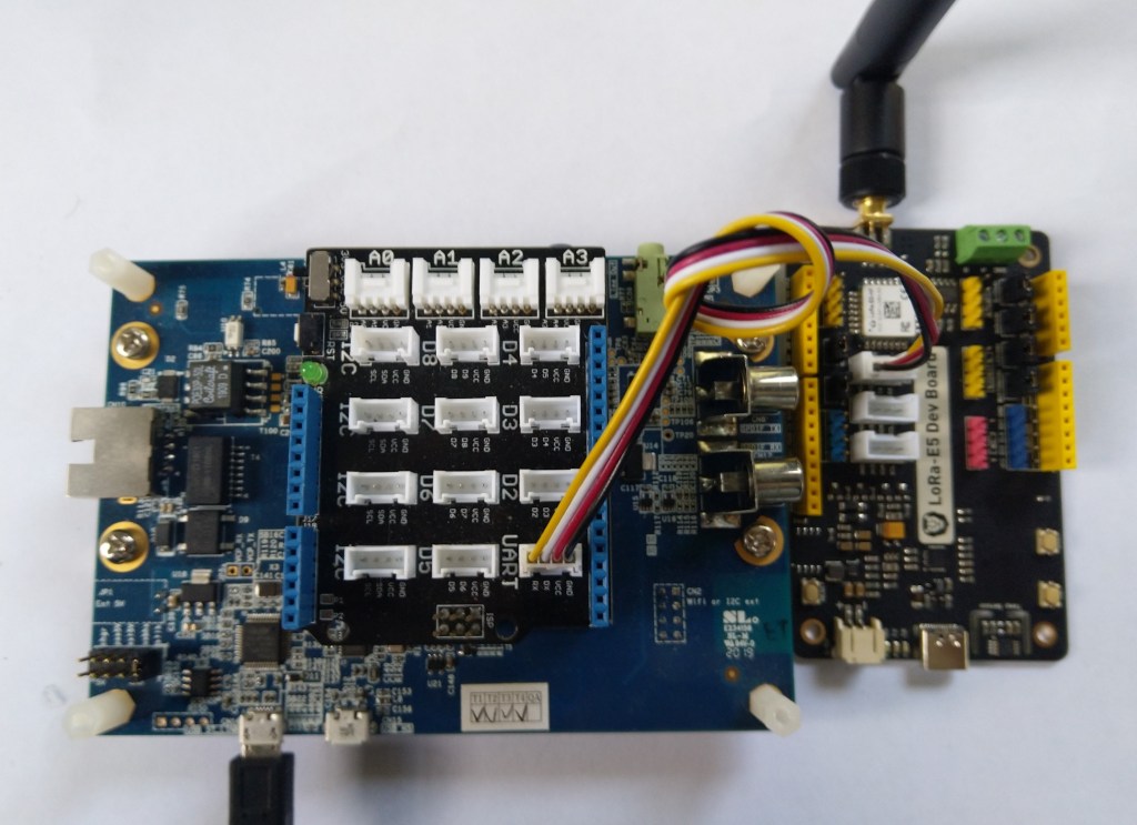 The source code of my nanoFramework C# Seeed LoRa-E5 library is live on GitHub. My initial test rig was based on an STM32F691DISCOVERY board which has an Arduino Uno R3 format socket for a Grove Base Shield V2.0. I then connected it to my LoRa-E5 Development Kit with a Grove – Universal 4 Pin 20cm Unbuckled Cable(TX/RX reversed)