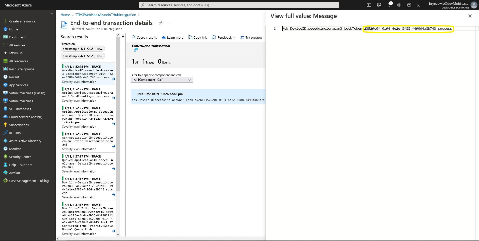 When I connected to my Azure IoT Hub shortly after starting the Myriota Azure IoT Connector Function my test devices started connecting as messages arrived.