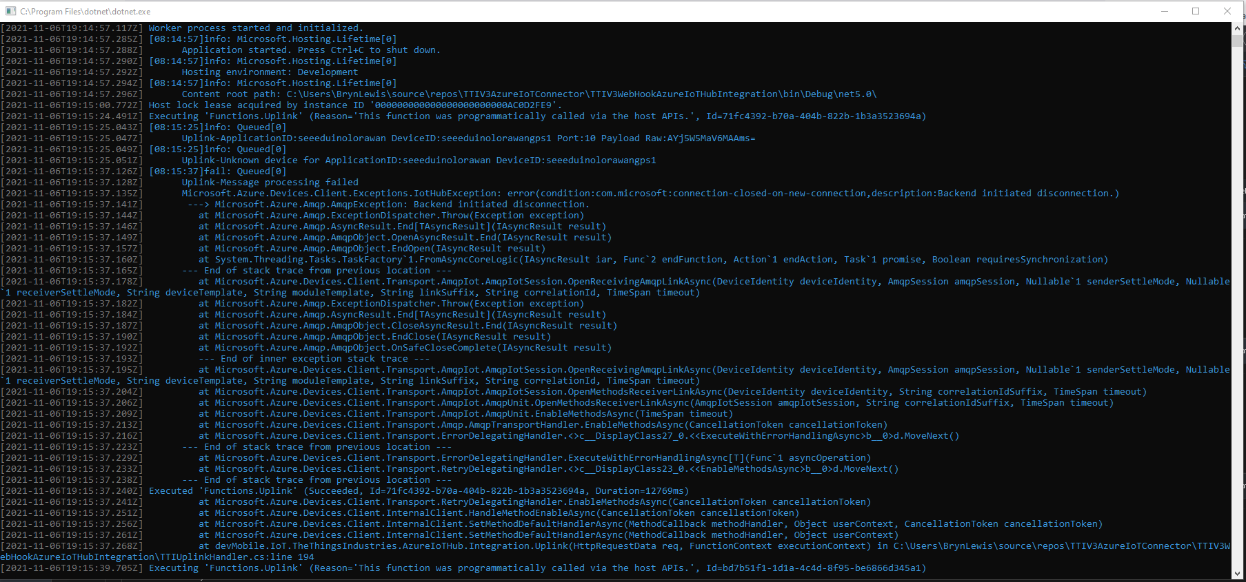 The UplinkWebhook controller “automagically” deserialises the message, then in code the embedded JSON is deserialised and “unpacked”, finally the processed message is inserted into an Azure Storage queue.