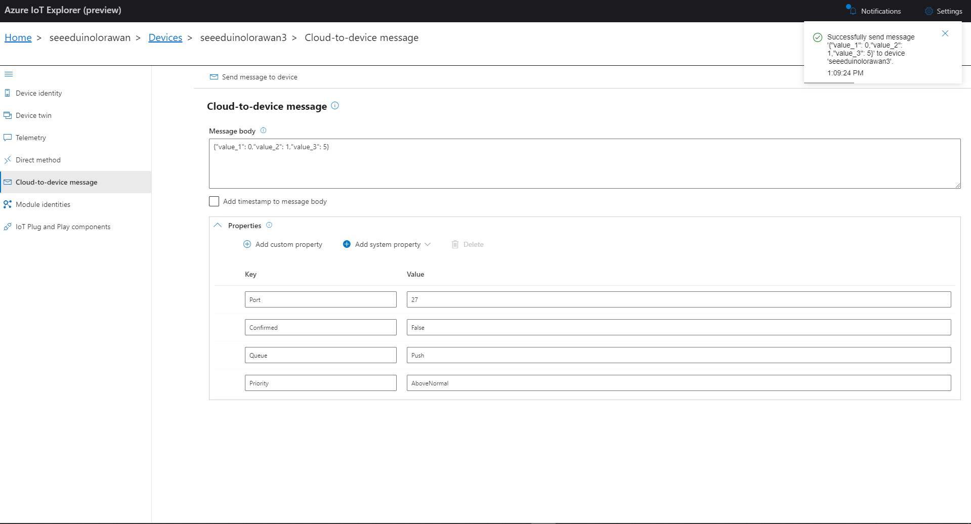 In this version a downlink message can be sent to a device only after an uplink message. I’m looking at adding an Azure Function which initiates a connection to the configured Azure IoT Hub for the specified device to mitigate with this issue.