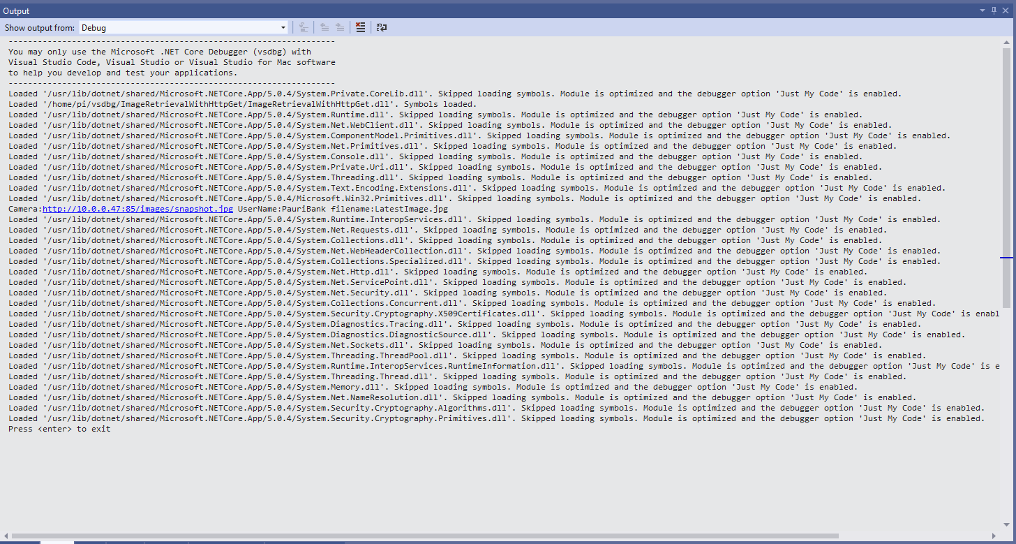 I tried to keep the .Net Core 5 console applications as simple as possible, they download an image from the camera “snapshot” endpoint (In this case http://10.0.0.47:85/images/snapshot.jpg), save it to the local filesystem and then upload it.