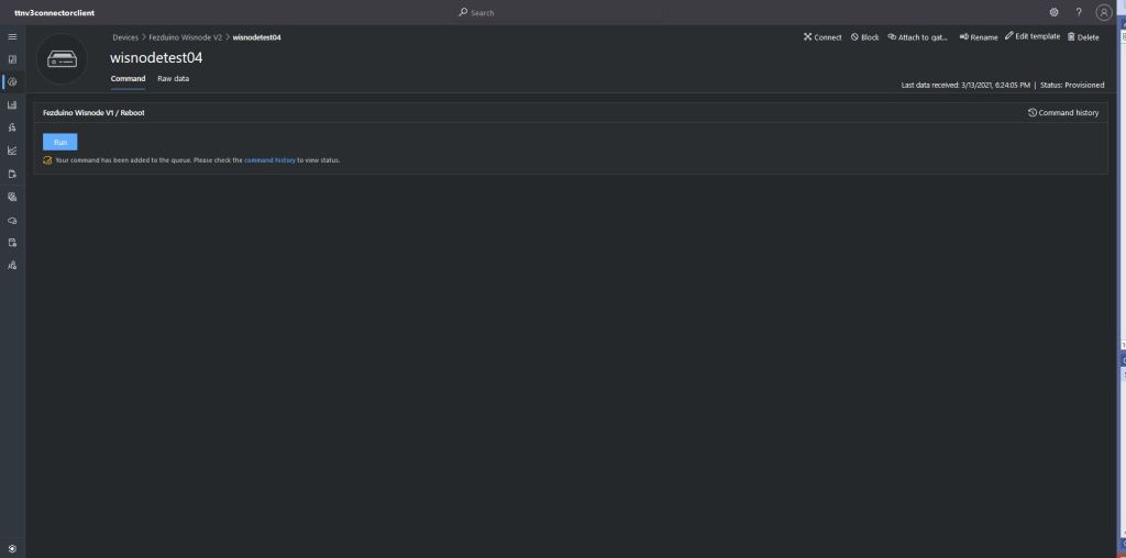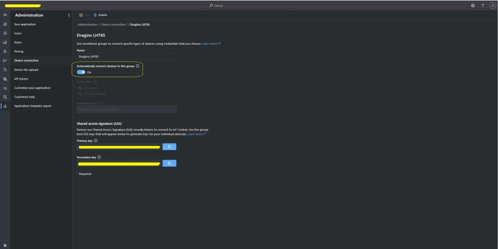 The first step was to configure and Azure IoT Central enrollment group (ensure “Automatically connect devices in this group” is on for “zero touch” provisioning) and copy the IDScope and Group Enrollment key to the TTI Connector configuration