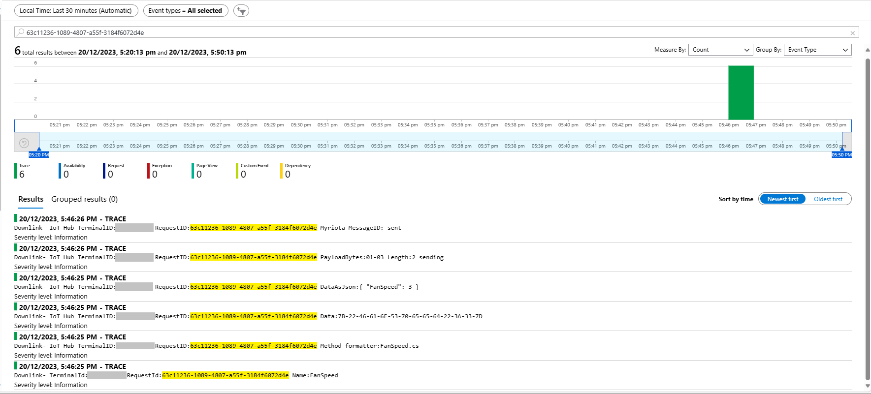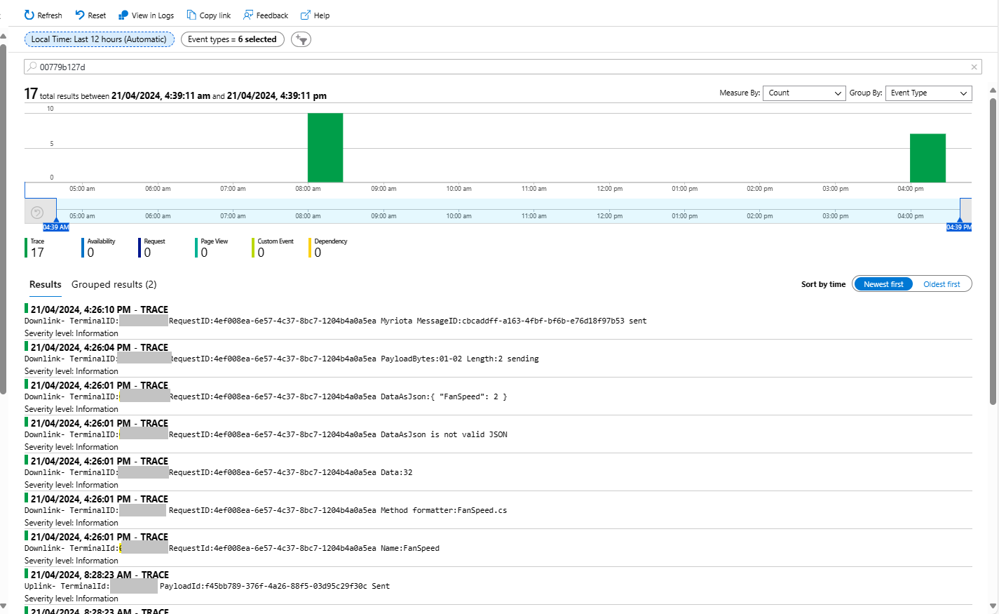 Each Azure Application Insights log entry starts with the TerminalID (to simplify searching for all the messages related to device) and the requestId a Globally Unique Identifier (GUID) to simplify searching for all the “steps” associated with sending/receiving a message) with the rest of the logging message containing “step” specific diagnostic information.