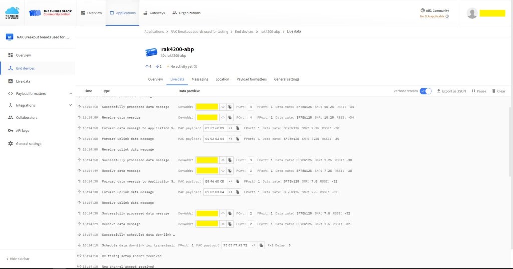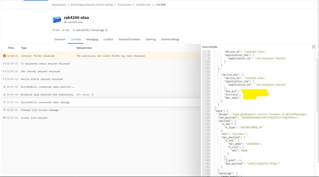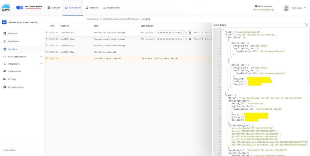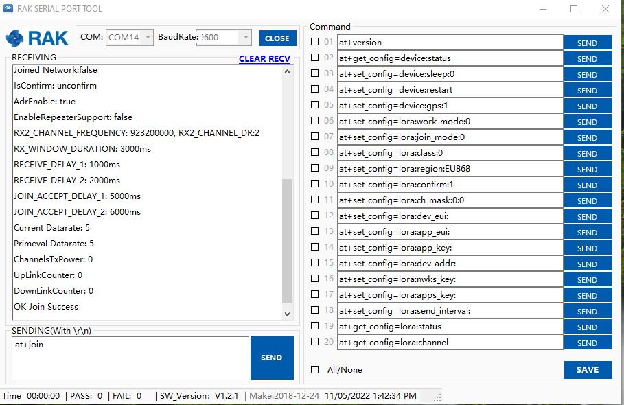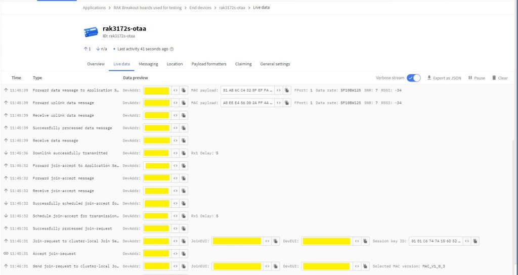 The RAKwireless RAK3172 module has “ATR – Restore to Default Parameters” command. To see what settings were “restored” I modified the BreakOutSerial application to send an ATR command to reset the device, then display the DevEUI, JoinEUI, and AppKey.