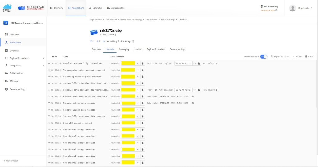 To reconfigure the device I ran the RAK3172LoRaWANDeviceClient application with DEVICE_DEVEUI_SET, OTAA, UNCONFIRMED, REGION_SET and ADR_SET defined. The testrig could then successfully connect to The Things Network and when the device was power cycled the configuration was retained.
