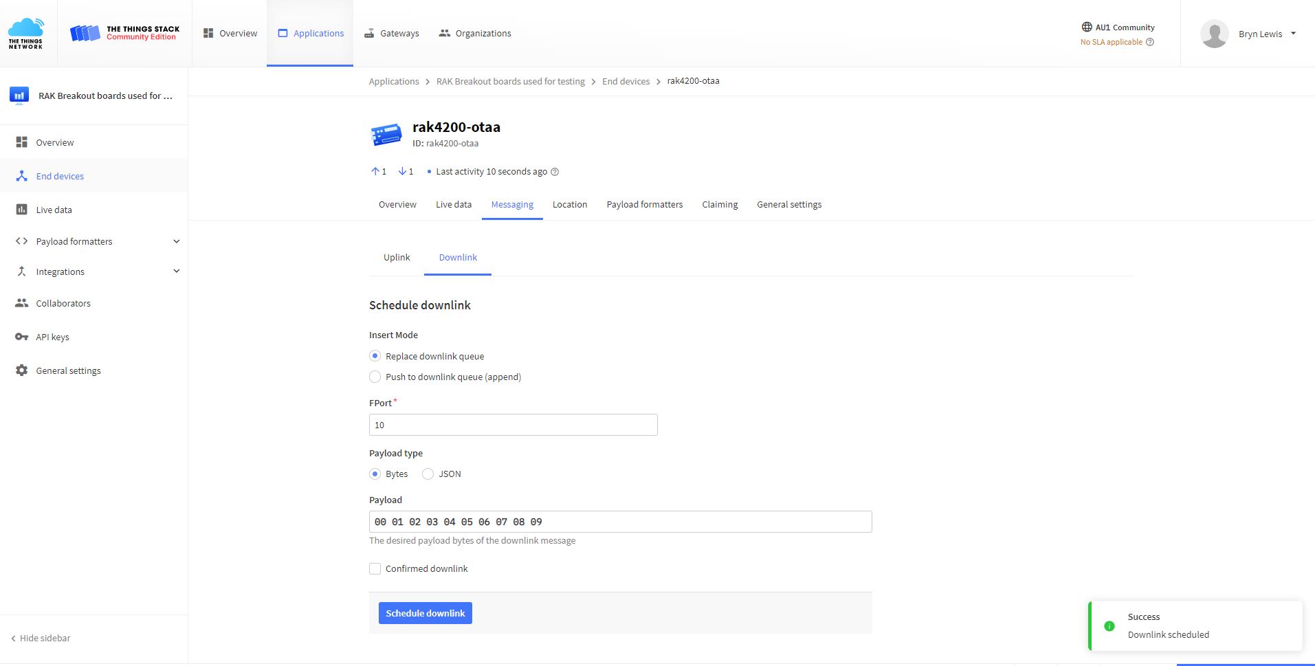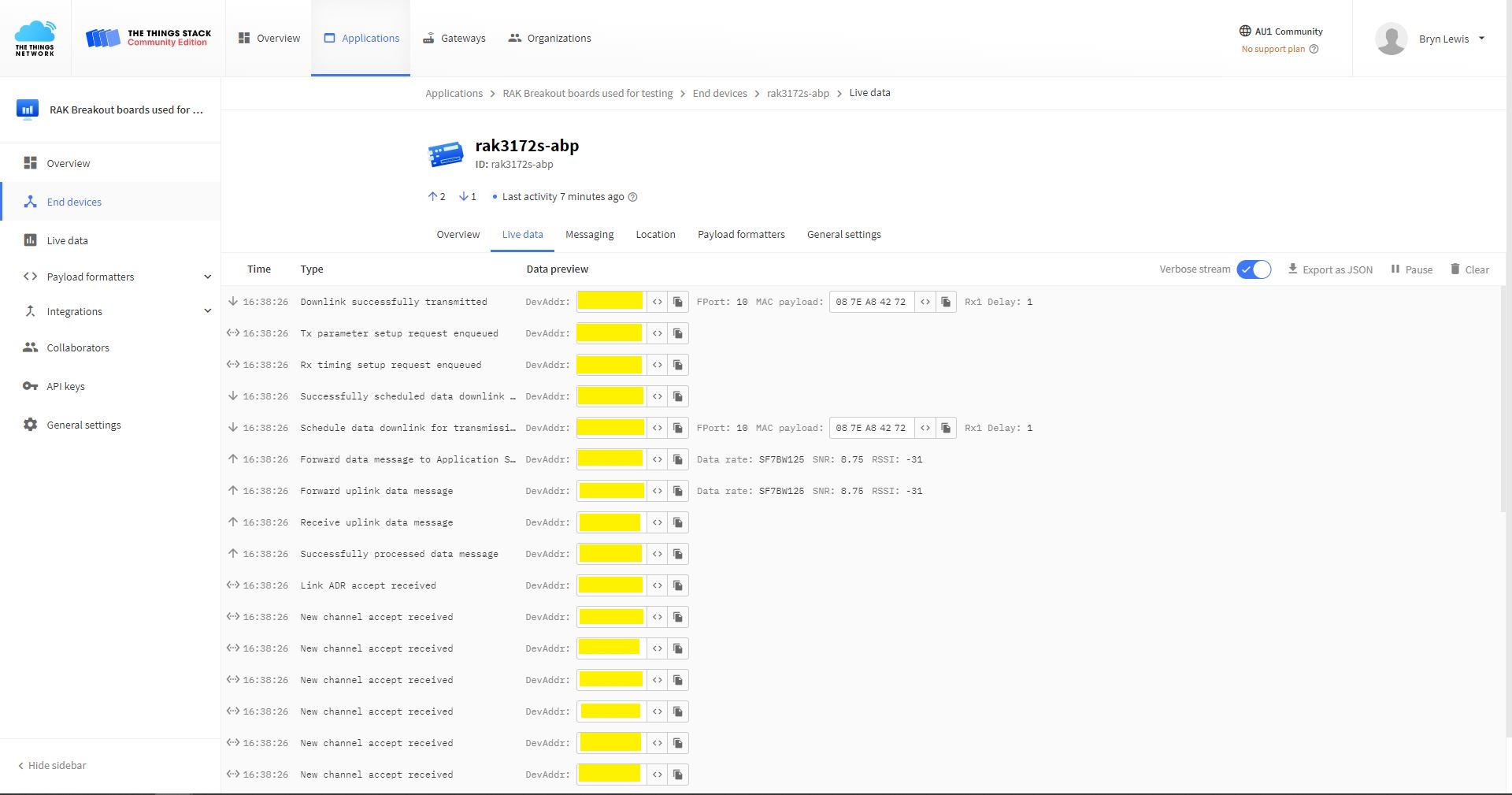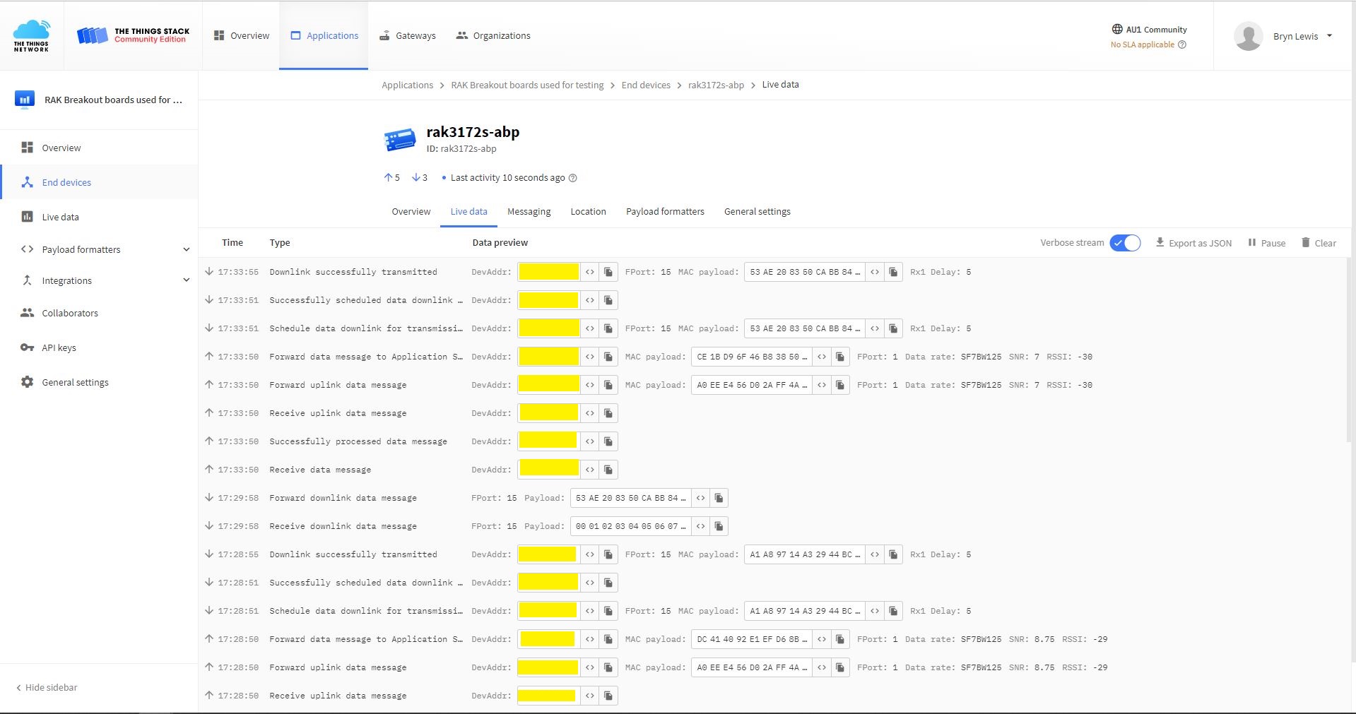 To reconfigure the device I ran the RAK3172LoRaWANDeviceClient application with DEVICE_DEVEUI_SET, OTAA, UNCONFIRMED, REGION_SET and ADR_SET defined. The testrig could then successfully connect to The Things Network and when the device was power cycled the configuration was retained.
