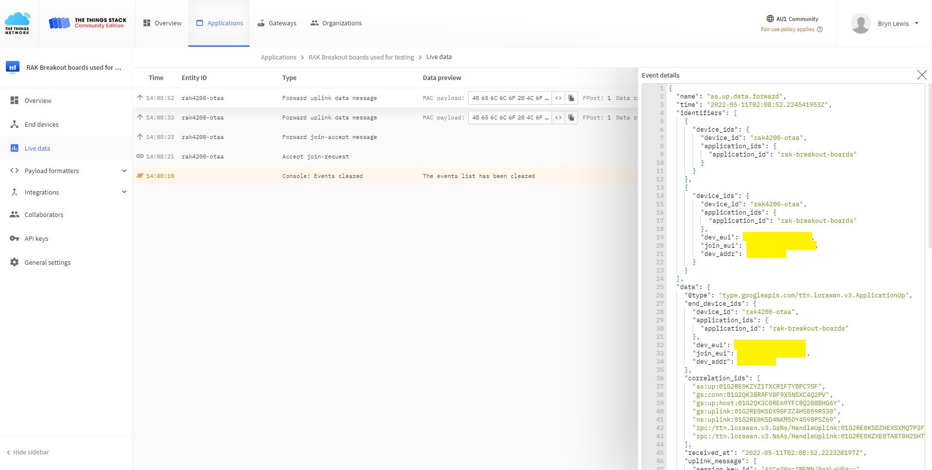 The RAKwireless RAK3172 module has “ATR – Restore to Default Parameters” command. To see what settings were “restored” I modified the BreakOutSerial application to send an ATR command to reset the device, then display the DevEUI, JoinEUI, and AppKey.