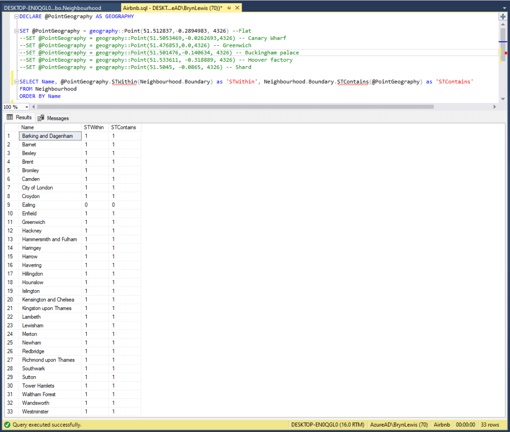 SELECT Name, @PointGeography.STWithin(Neighbourhood.Boundary) as 'STWithin', Neighbourhood.Boundary.STContains(@PointGeography) as 'STContains'