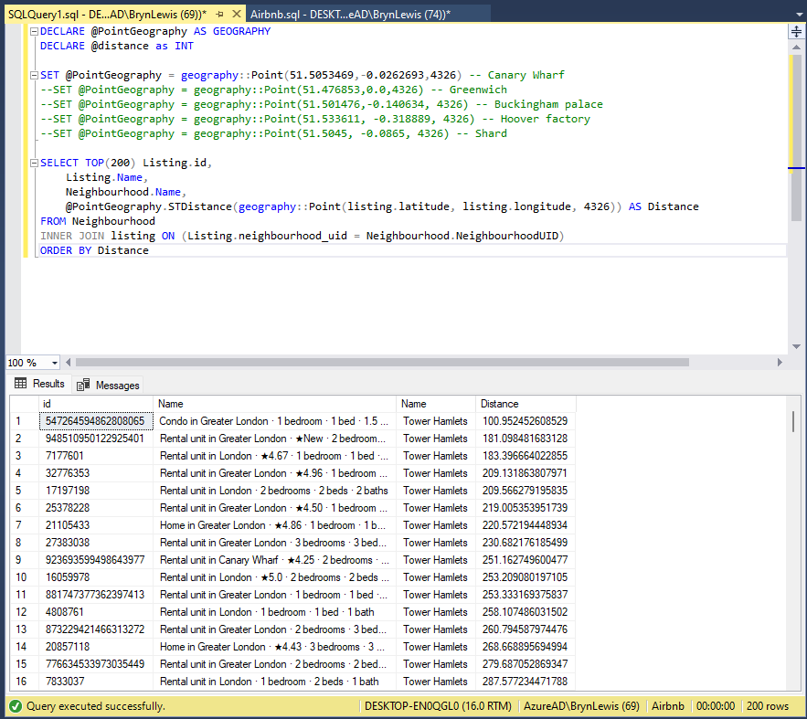 --SET @PointGeography = geography::Point(51.5053469,-0.0262693,4326) -- Canary Wharf