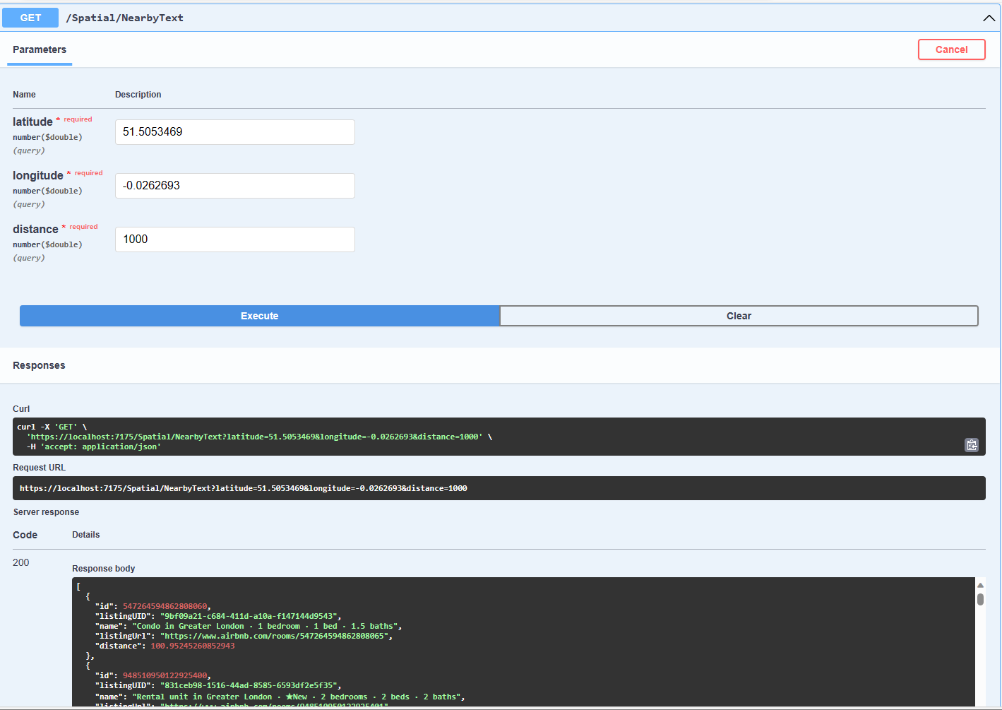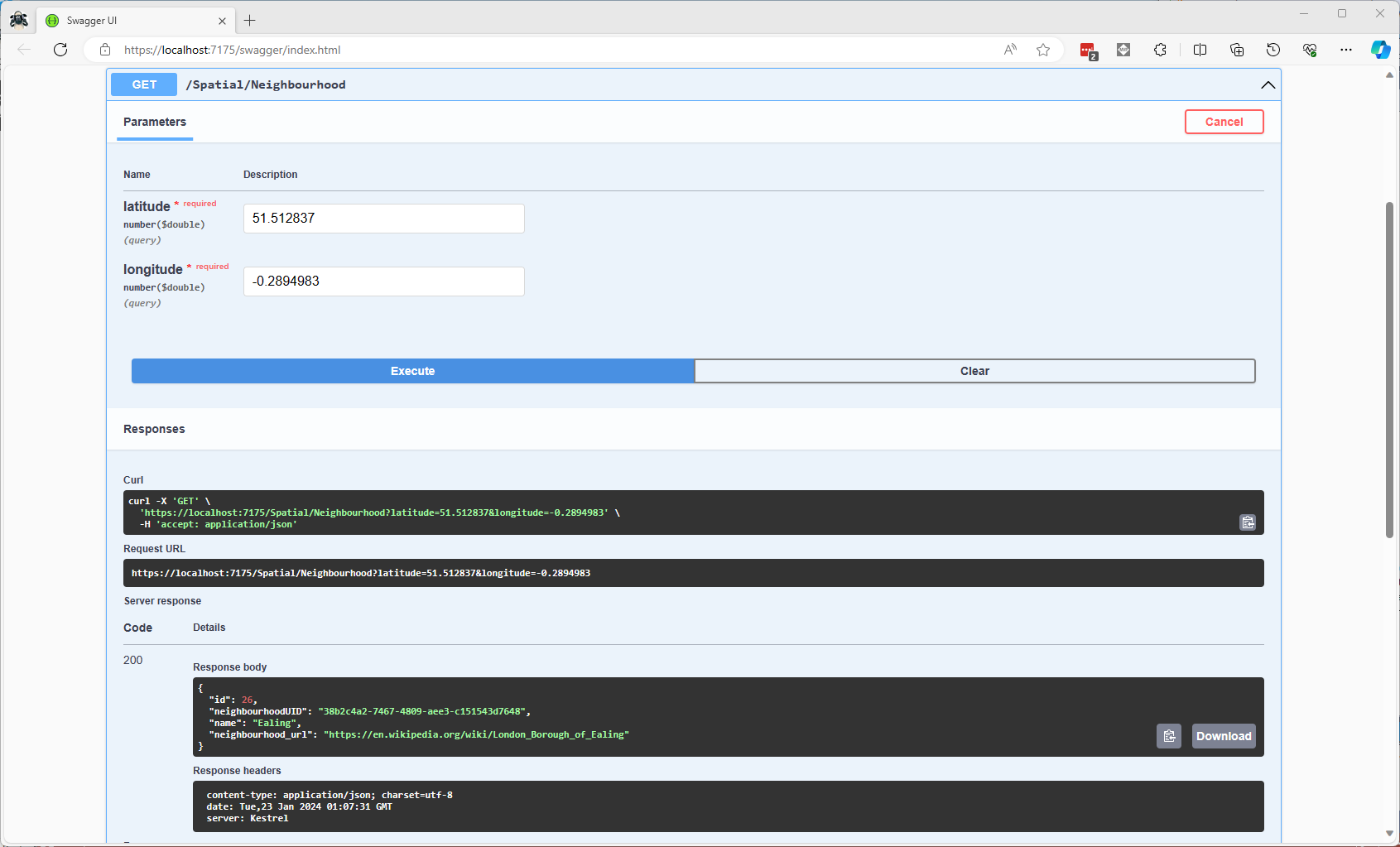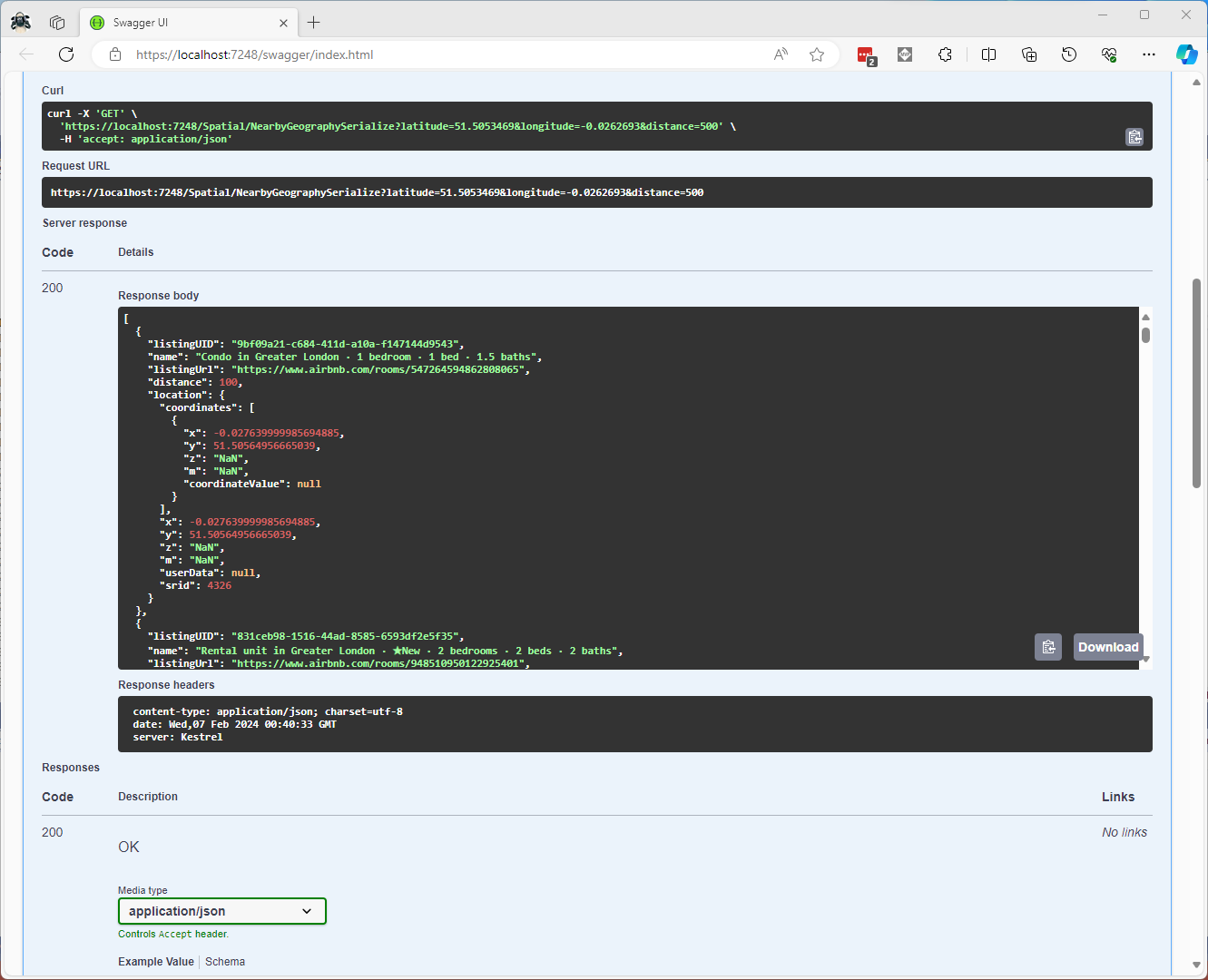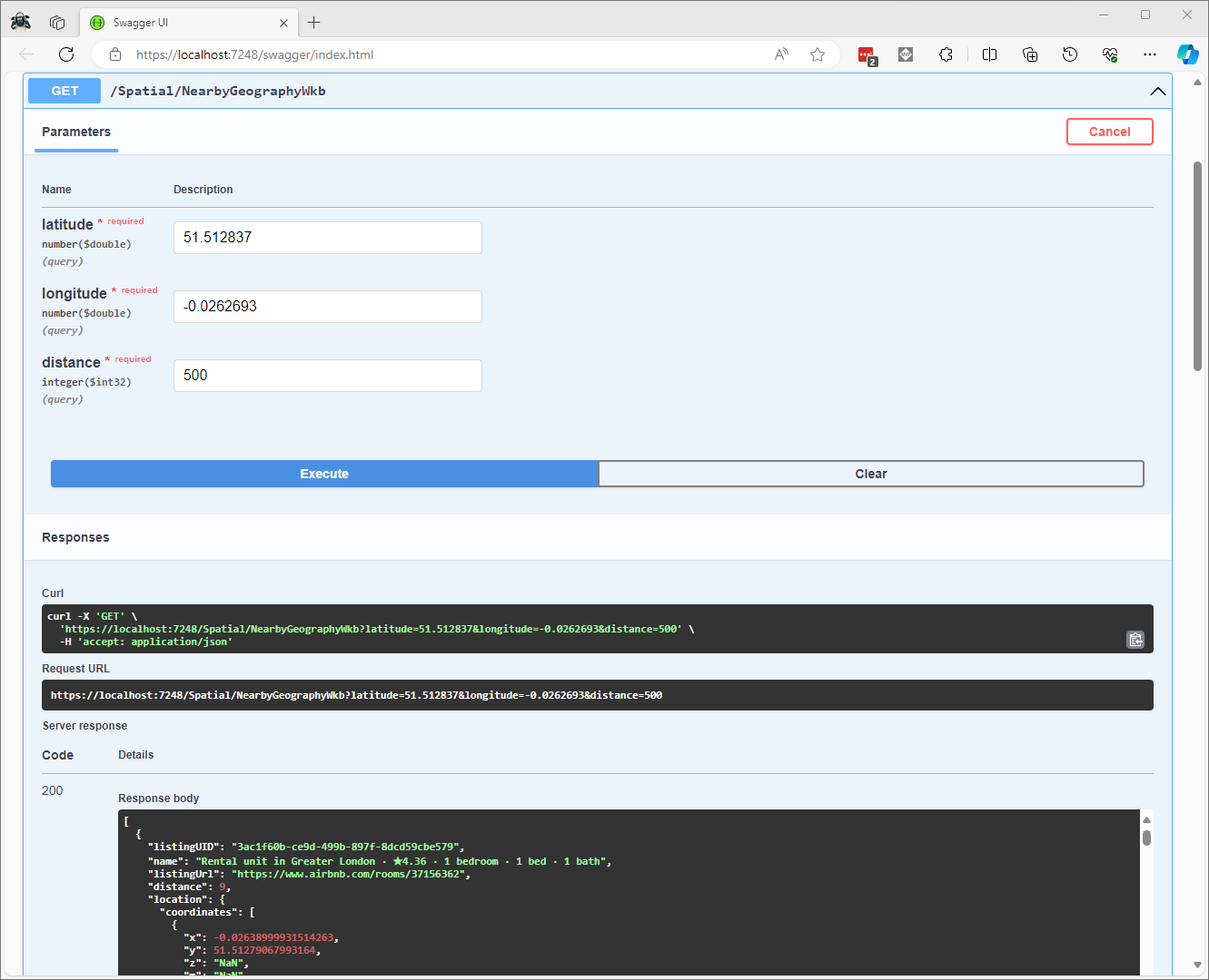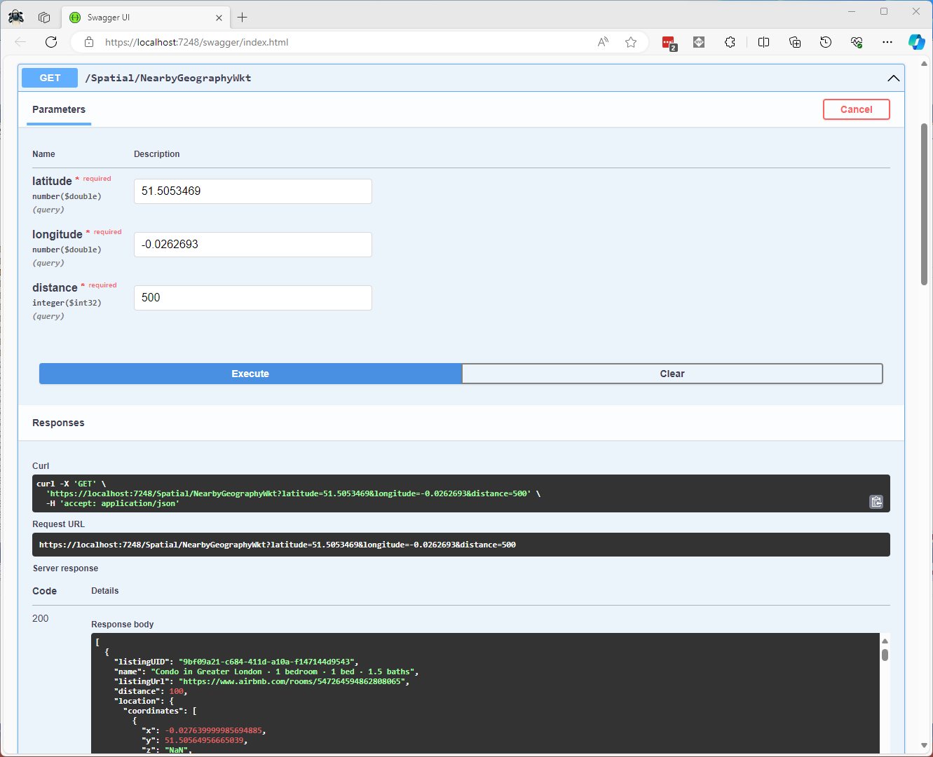 I have focused on getting the spatial queries to work and will stress/performance test my implementations in a future post. I will also revisit the /Spatial/NearbyGeography method to see if I can get it to work without “Location.Serialize() as Location”.