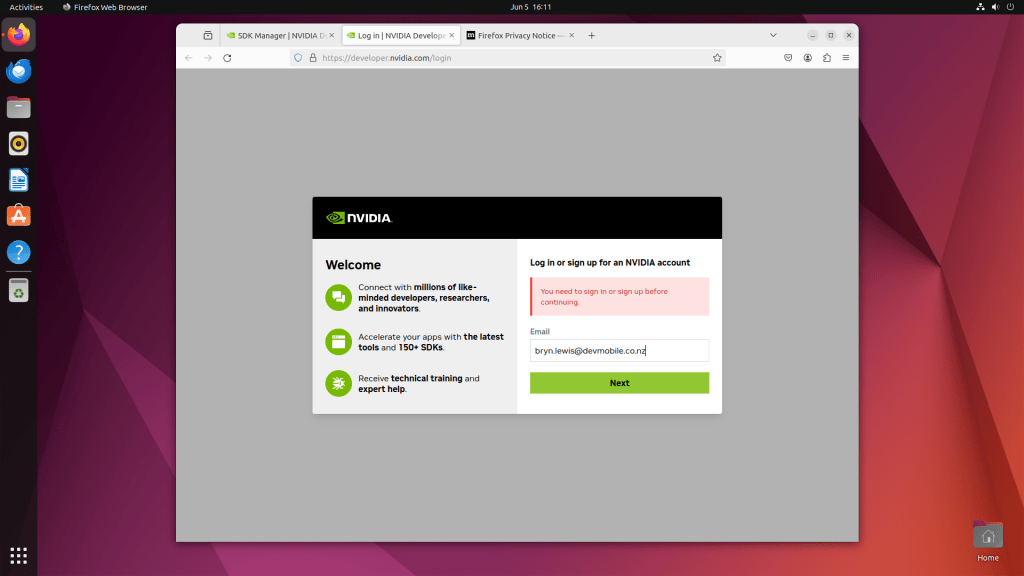 An NVIDIA Developer program login is required to launch the NVIDIA SDK Manager