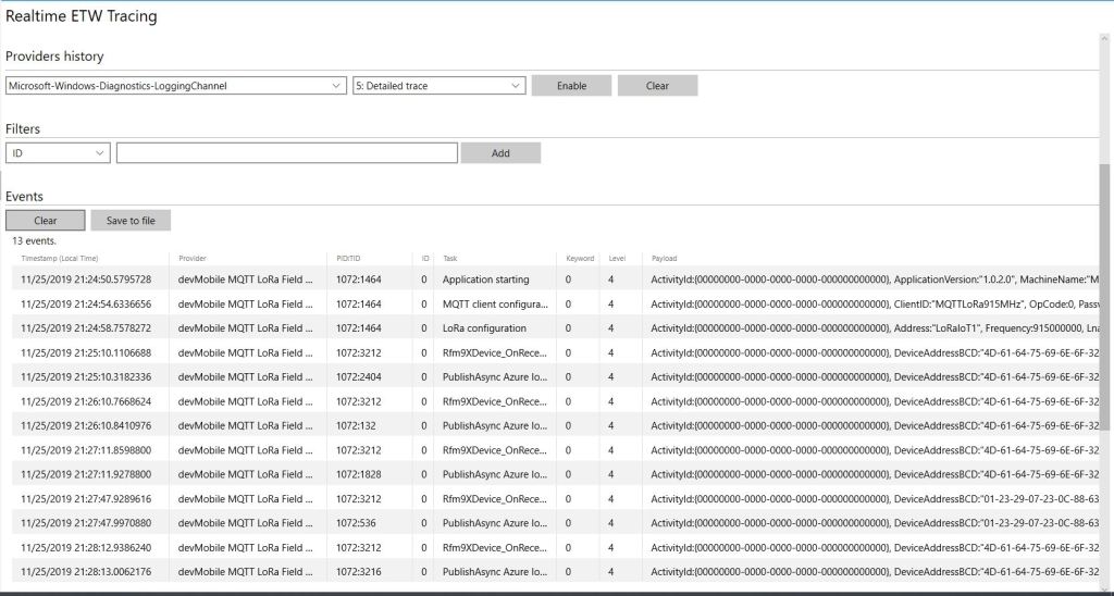 The application logs debugging information to the Windows 10 IoT Core ETW logging Microsoft-Windows-Diagnostics-LoggingChannel