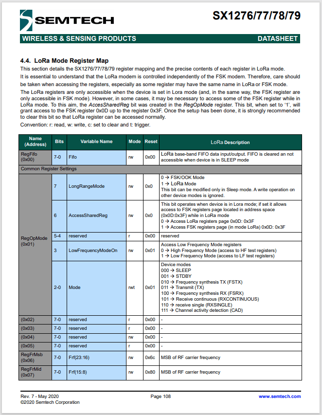 SX127X data sheet page 108 Register 0x0 to 0x07