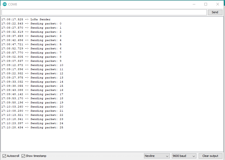 18:23:26-RX PacketSnr 10.0 Packet RSSI -47dBm RSSI -105dBm 15 byte message "HeLoRa World! 8"