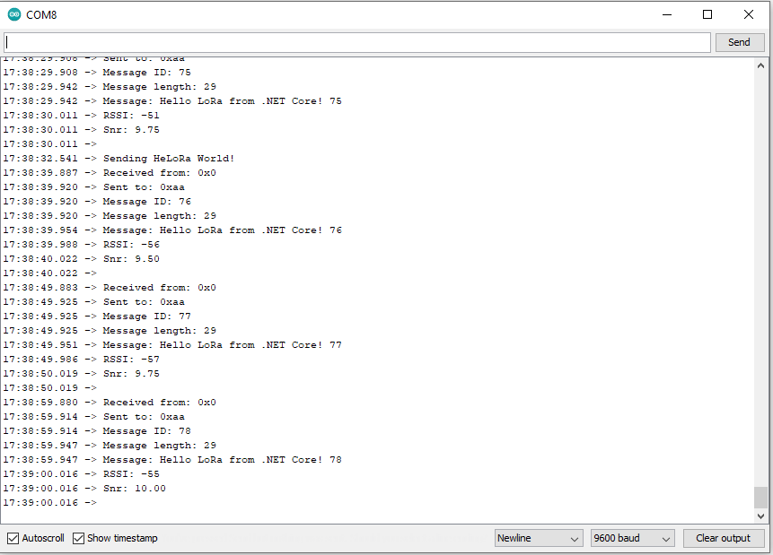 10:04:42-TX To 0x48 From 0x65 Count 108 28 bytes message Hello LoRa from .NET Core! 2