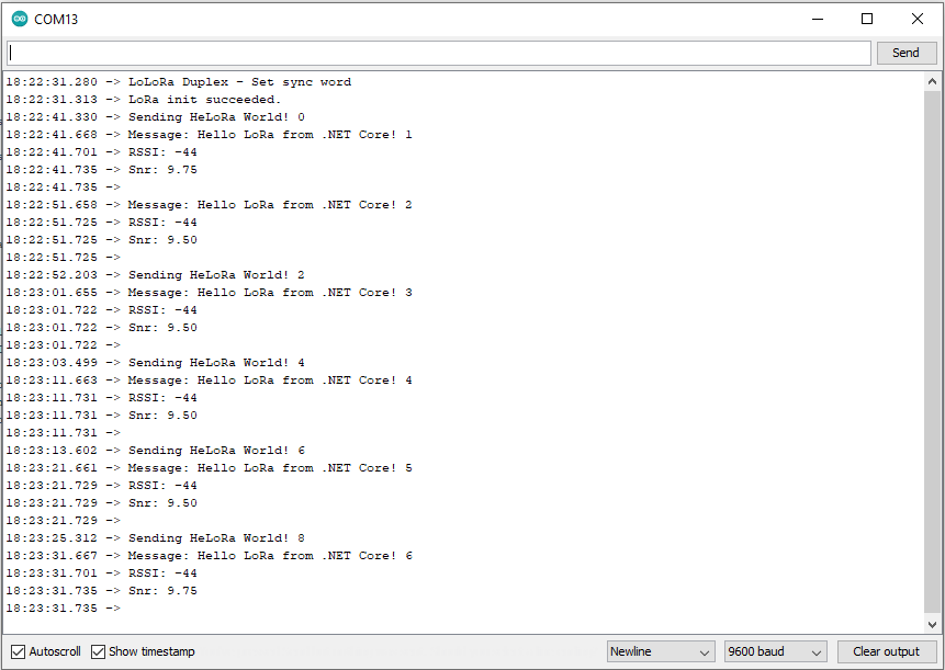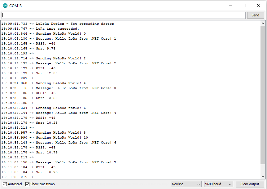 Sending 29 bytes message Hello LoRa from .NET Core! 13