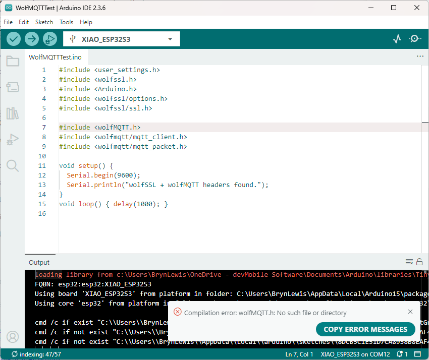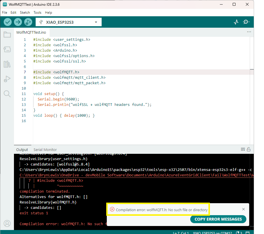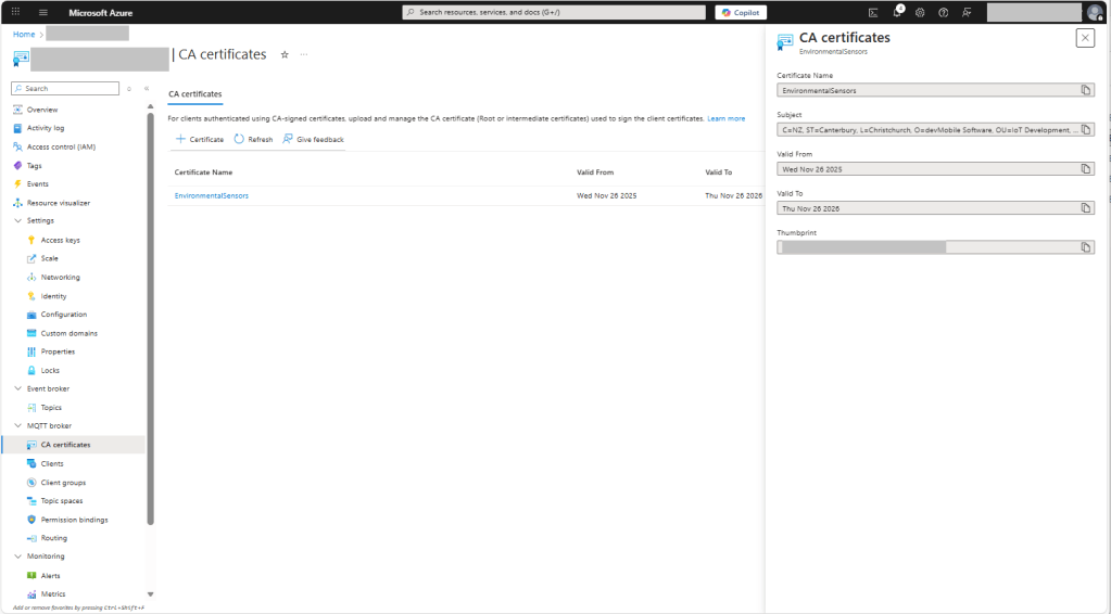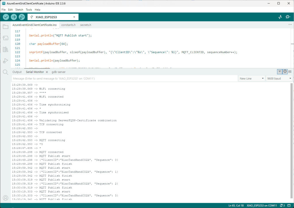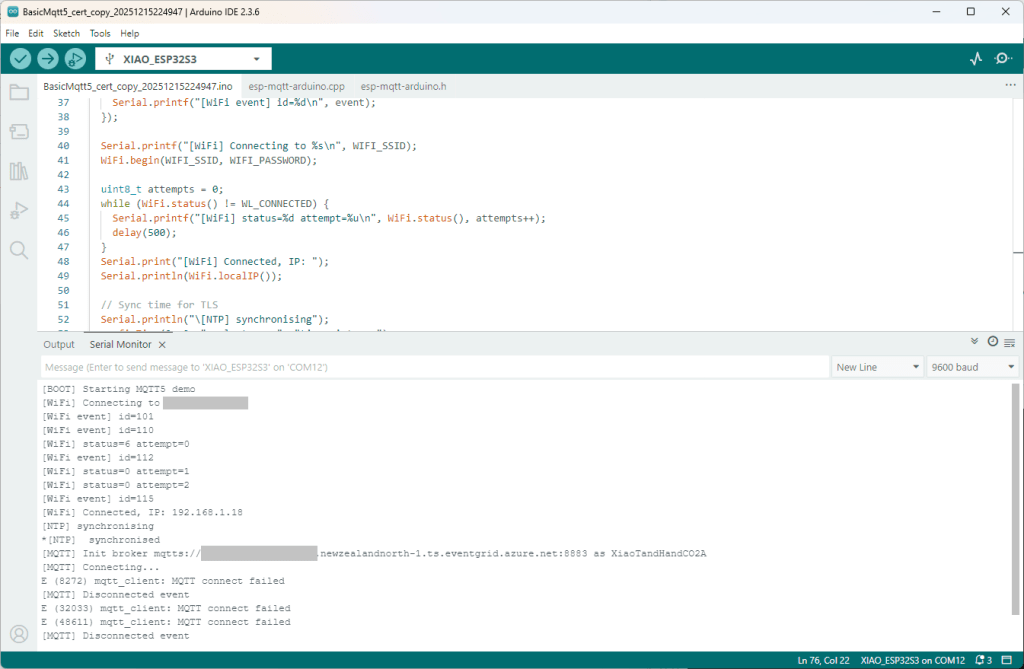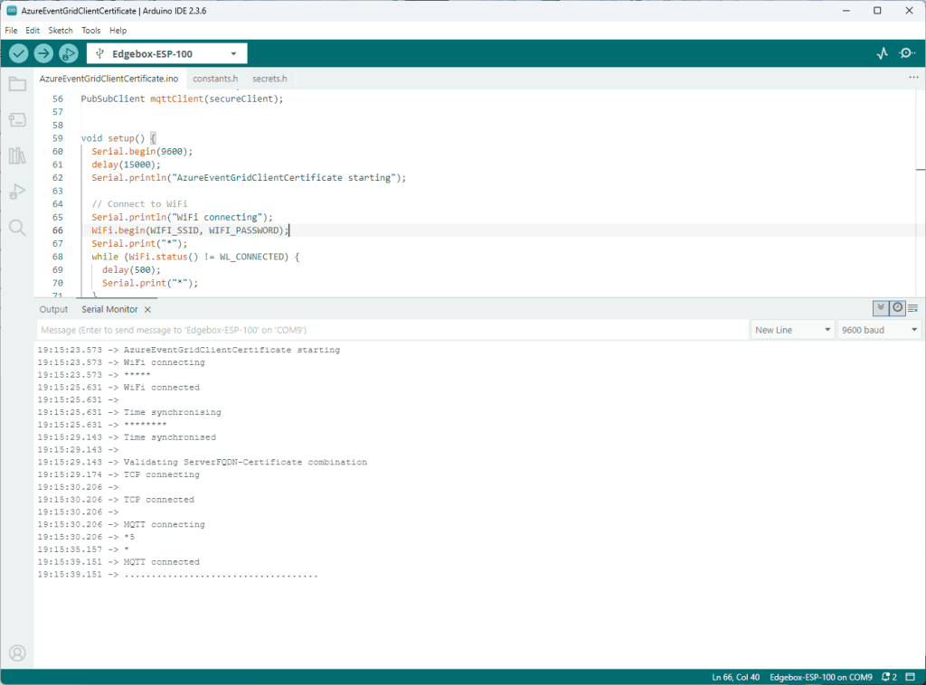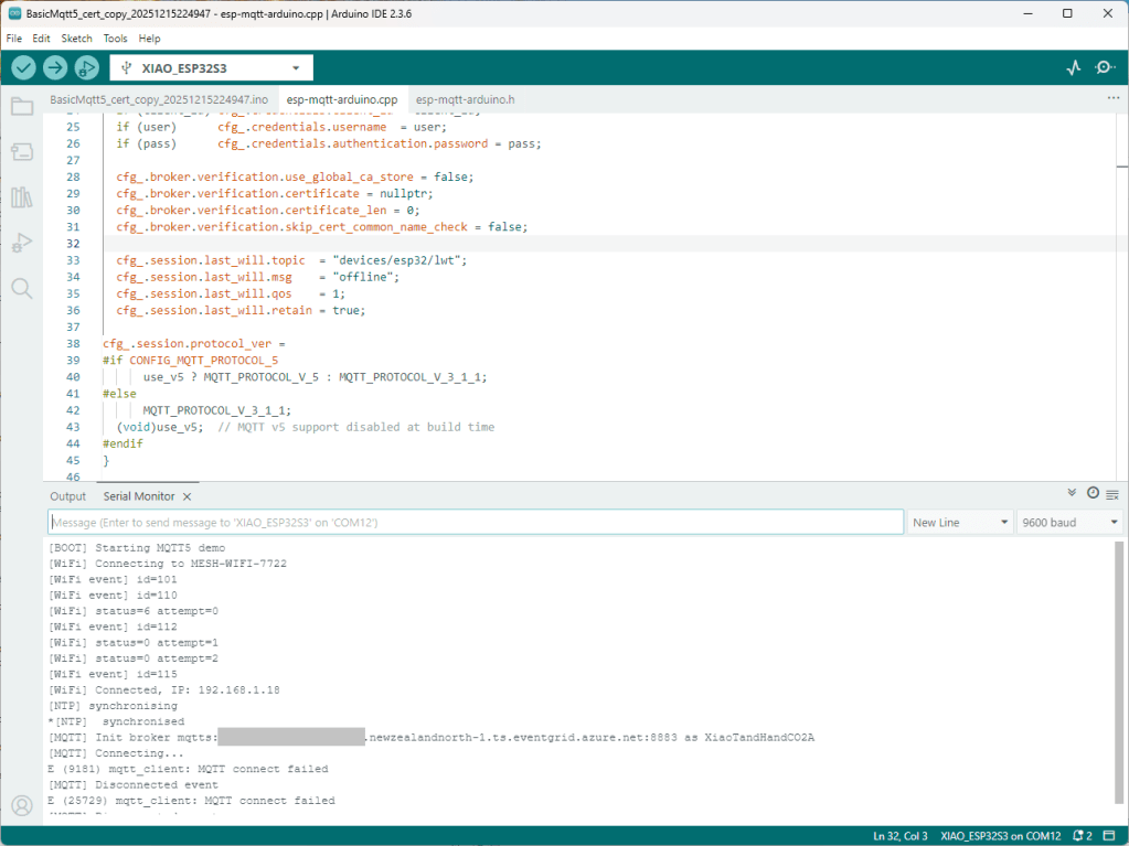 Still couldn’t figure out why my code was failing so I built a test harness which connected to the wifi, set the time with the Network Time Protocol(NTP), established a Transport Layer Security(TLS) connection with the Azure Event Grid MQTT Broker then finally Authenticated (using Client Certificate authentication). Basically, it was The joy of certs without the Arduino PubSubClient library and with authentication