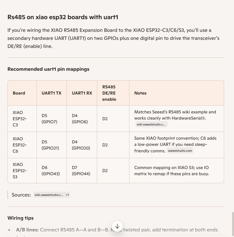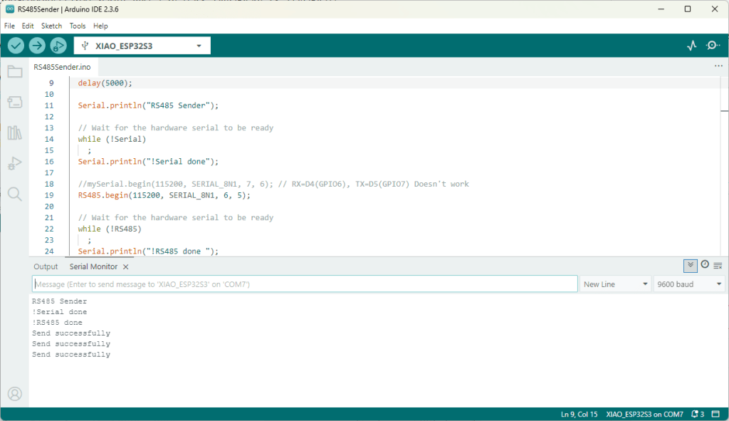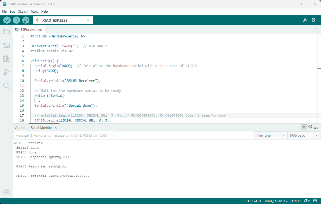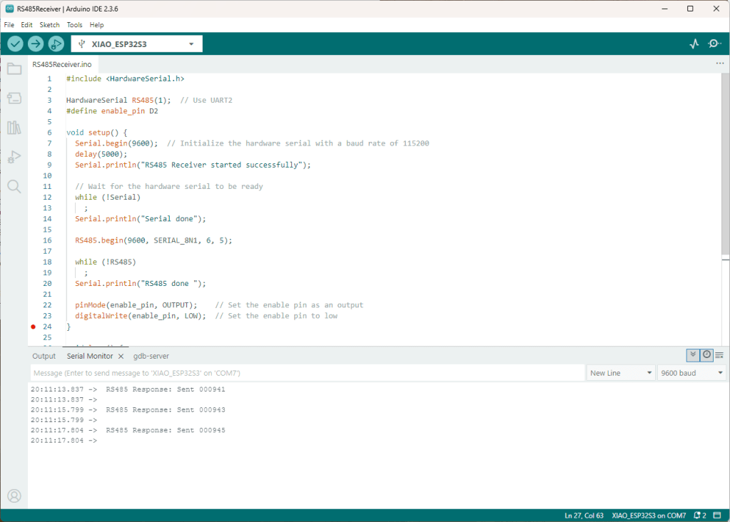 As part of a project to read values from a MODBUS RS-485 sensor using a RS-485 Breakout Board for Seeed Studio XIAO and a Seeed Studio XIAO ESP32-S3 I built the test harness described in the wiki post. The test harness setup for a Seeed Studio XIAO ESP32-C3/Seeed Studio XIAO ESP32-C6 didn’t work with my Seeed Studio XIAO ESP32-S3.