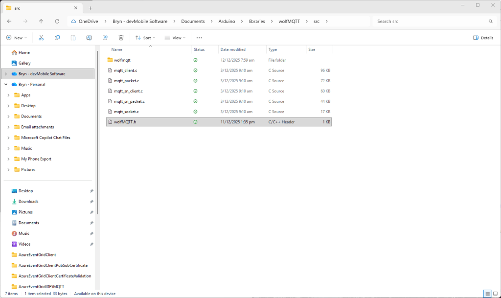 The CN: CN=DigiCert Global Root G3 and the wildcard CN=*.eventgrid.azure.net certificates were “concatenated” in the constants header file which is included in the main program file. The format of the certificate chain is described in the comments. Avoid blank lines, “rogue” spaces or other formatting as these may cause the WiFiClientSecure Mbed TLS implementation to fail.