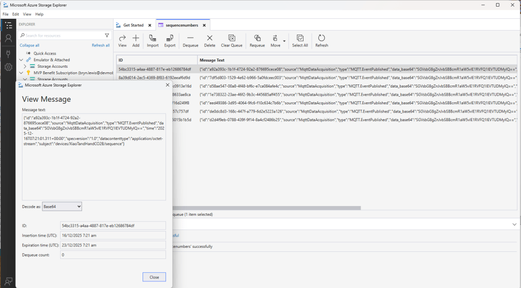 Just to make sure I checked that the message count in the Azure Storage Queue was increasing and the payload client ID matched my device