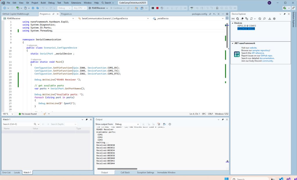 Getting my test harness RS485Sender and RS485Receiver applications (inspired by Seeedstudio wiki) took quite a bit longer than expected. Using Copilot worked better than expected but I think that might be because after doing some research my prompts were better.