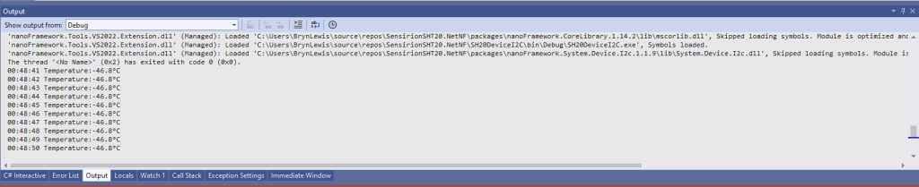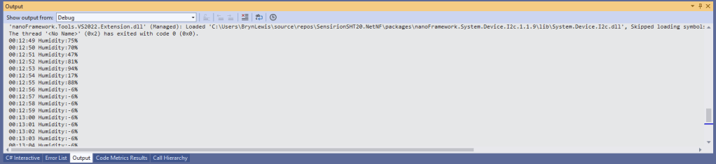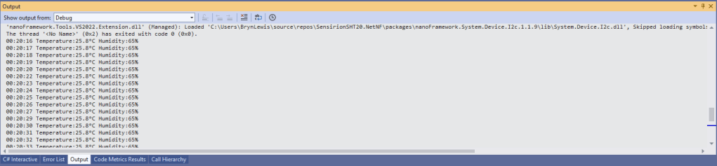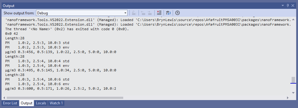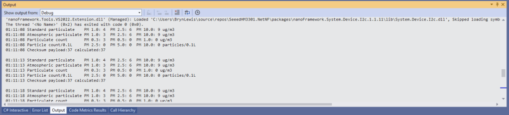 This is a “throw away” .NET nanoFramework application for investigating how Adafruit PMSA003I Inter Integrated Circuit bus(I²C) connectivity works.