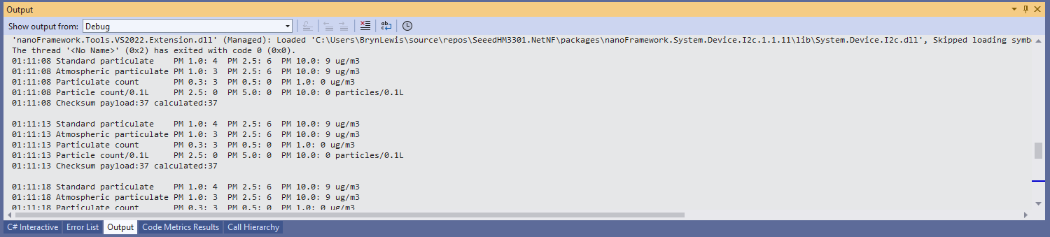 This is a “throw away” .NET nanoFramework application for investigating how Adafruit PMSA003I Inter Integrated Circuit bus(I²C) connectivity works.