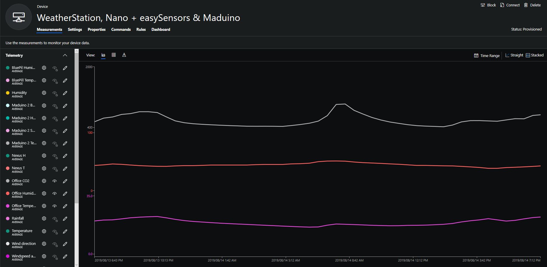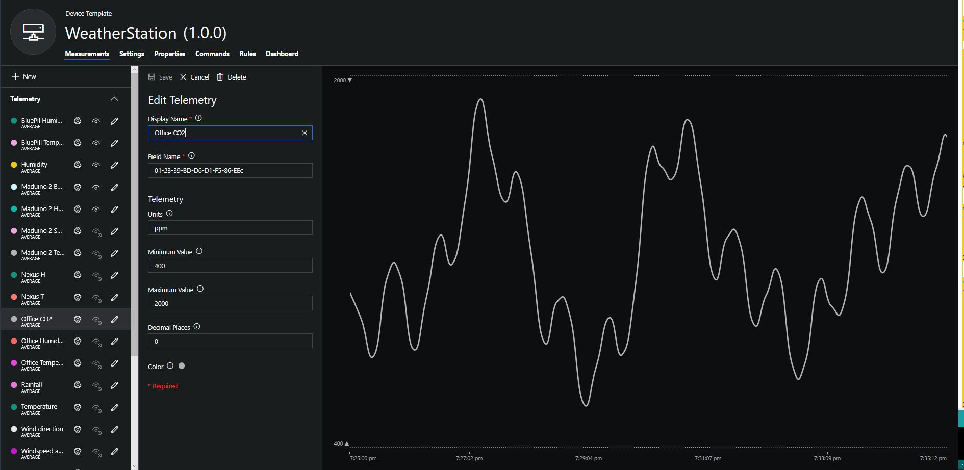 To configure the device in Azure IoT Central (similar process for Adafruit.IO, working on support for losant, and ubidots) I copied the SNo: from the Arduino development tool logging window and appended c for the CO2 parts per million (ppm), h for the humidity % and t for the temperature °C to the unique serial number from the ATSHA204A chip. (N.B. pay attention to the case of the field names they are case sensitive)